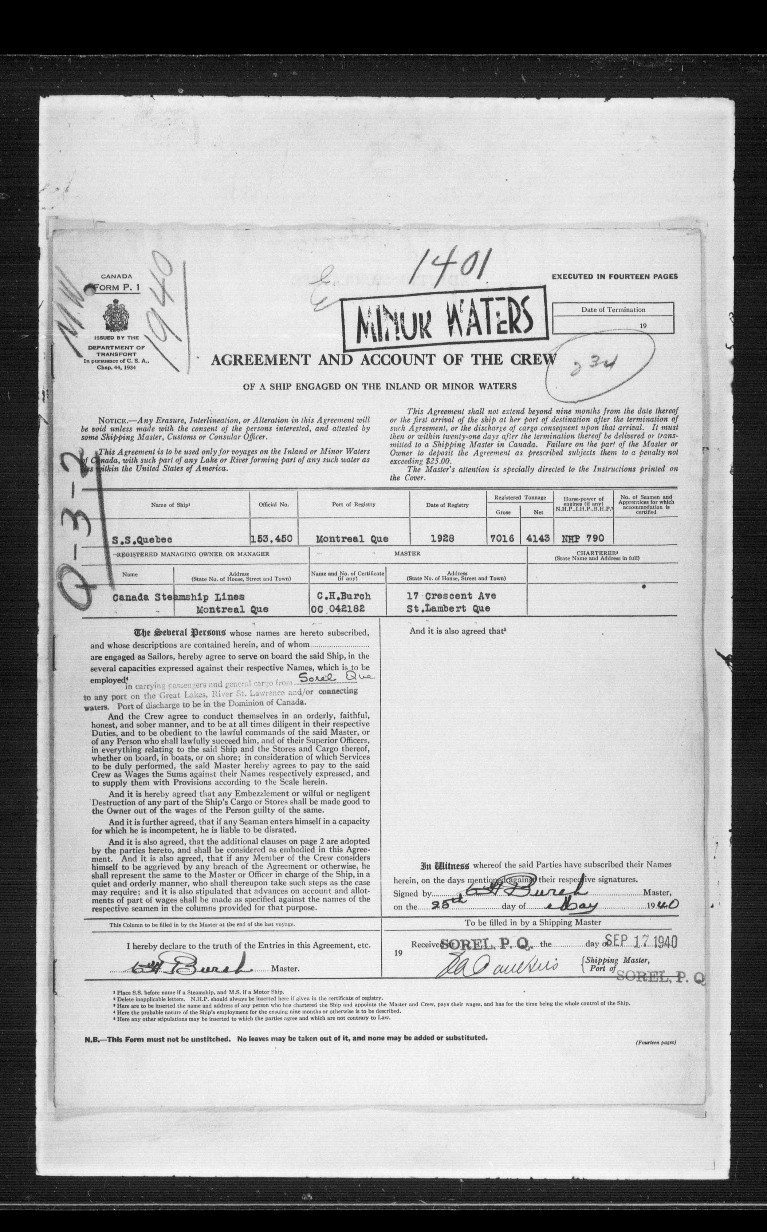 Canadian Marine Transportation Administration, Canadian Coast Guard, Ship Safety Branch, Central Registry of Seamen, Articles of Agreement and Ships' Logs - 11825