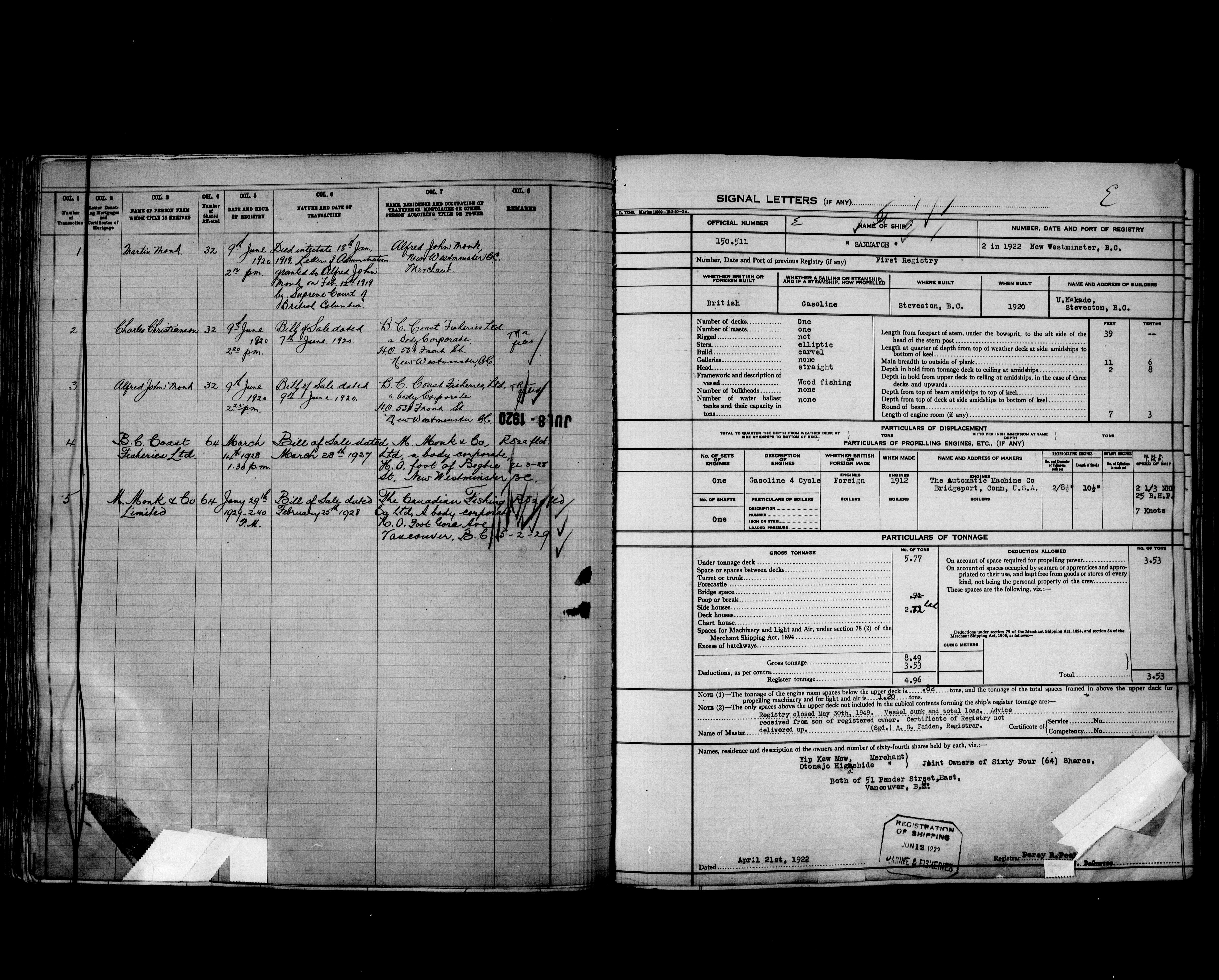 Department of Transport : Registers and ledgers cards of ships closed-out (1904-1983) - 11907