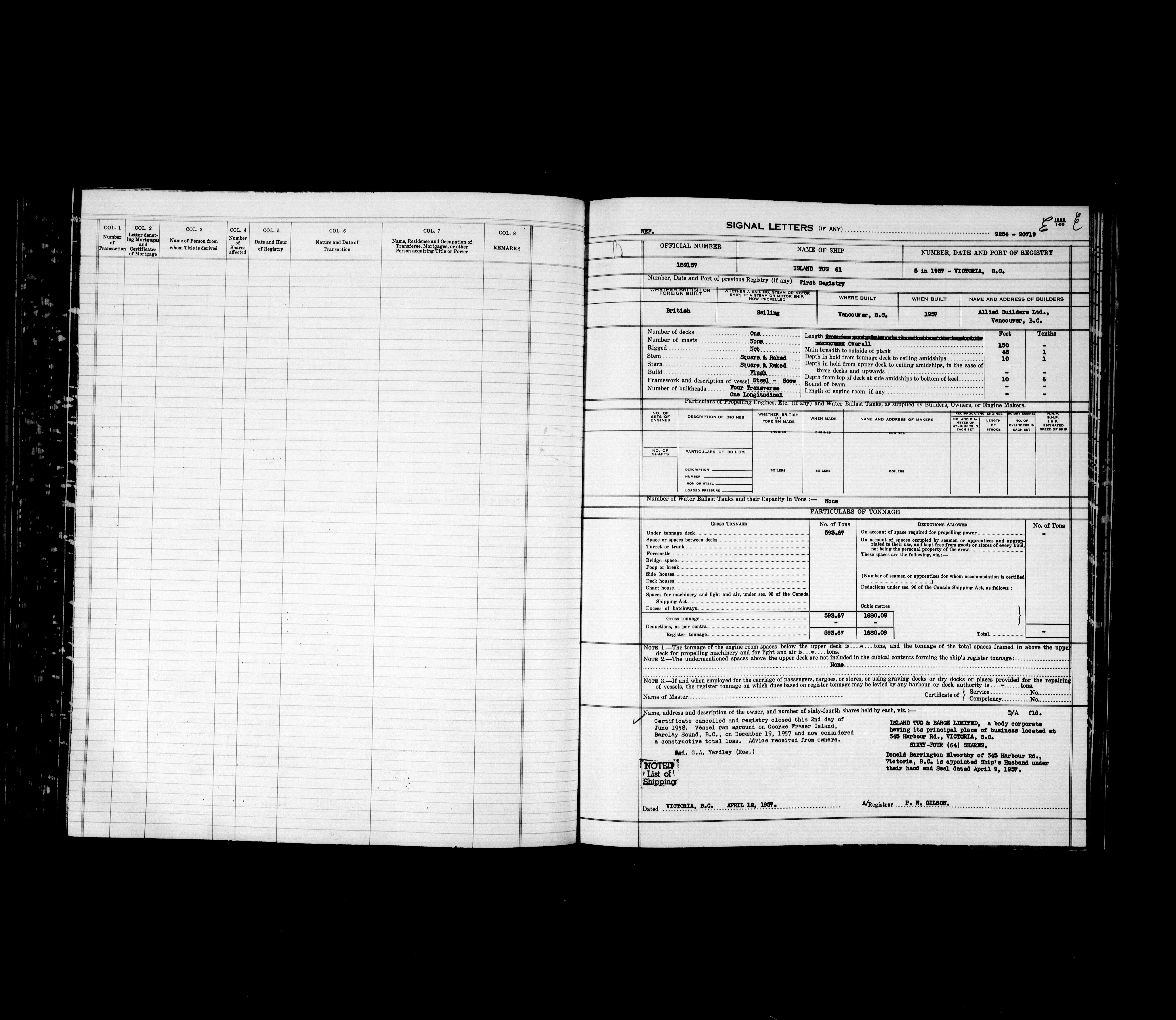 Department of Transport : Registers and ledgers cards of ships closed-out : T-11915