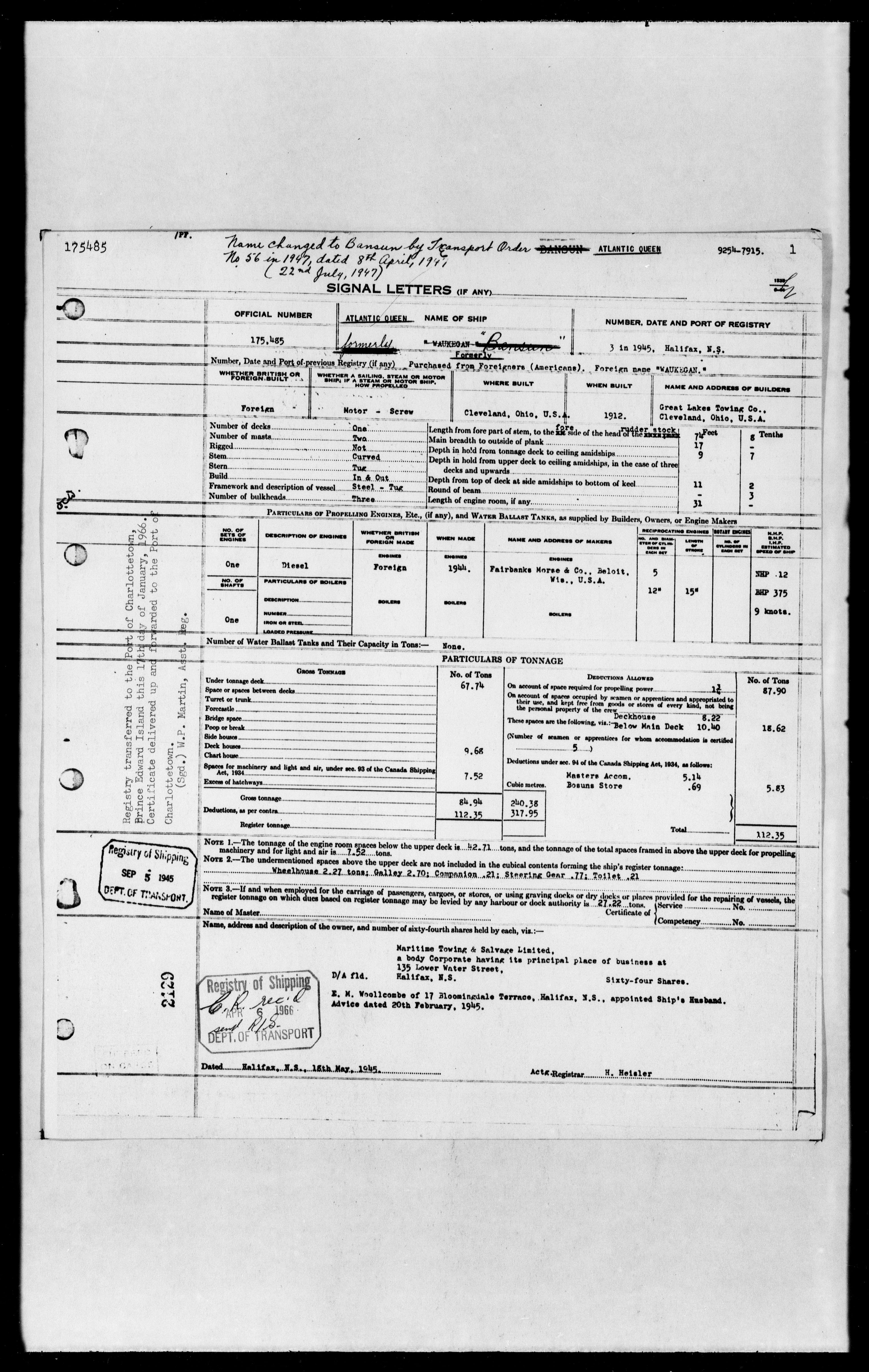Department of Transport : Registers and ledgers cards of ships closed-out (1904-1983) - 11924