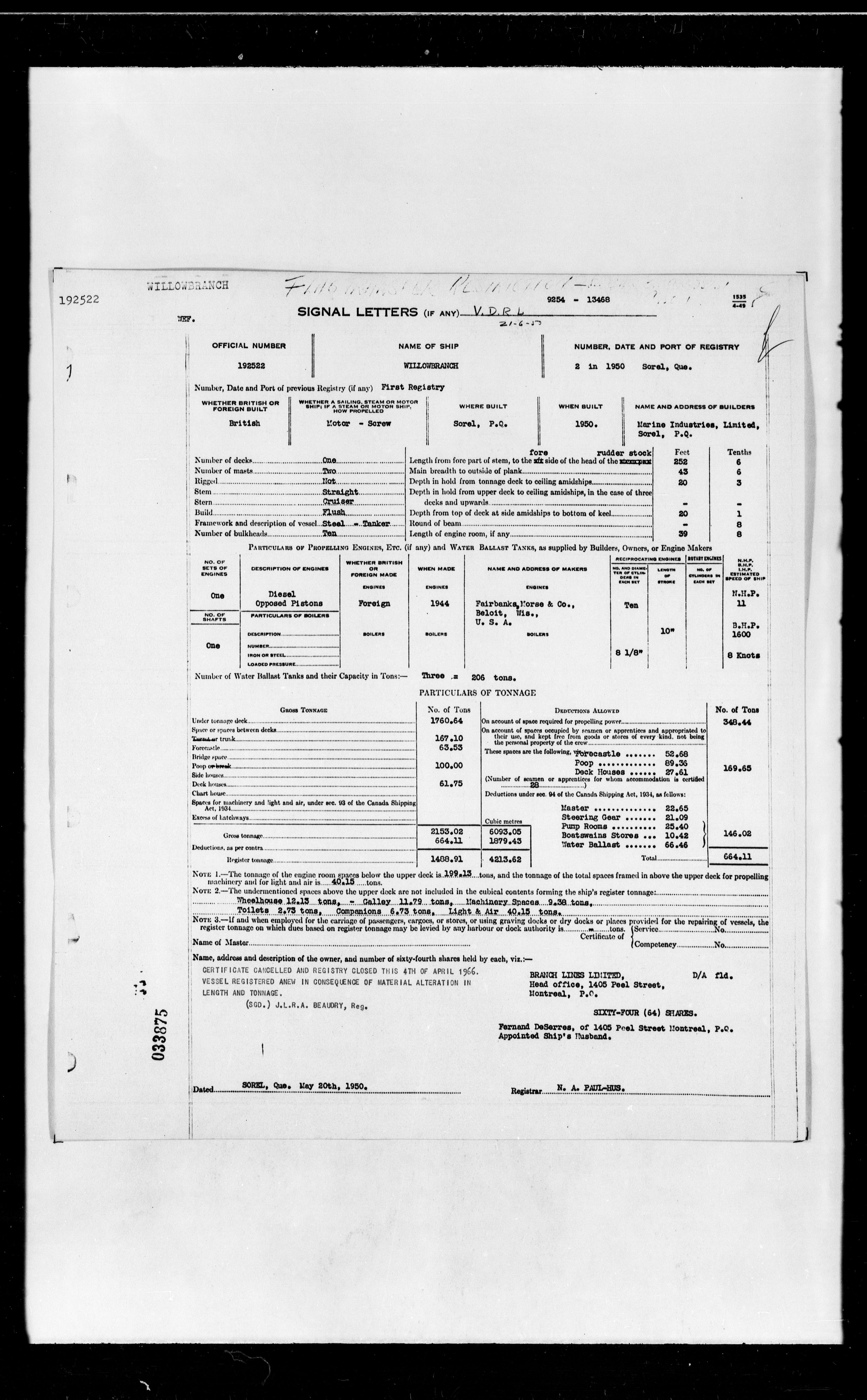 Department of Transport : Registers and ledgers cards of ships closed-out : T-11925