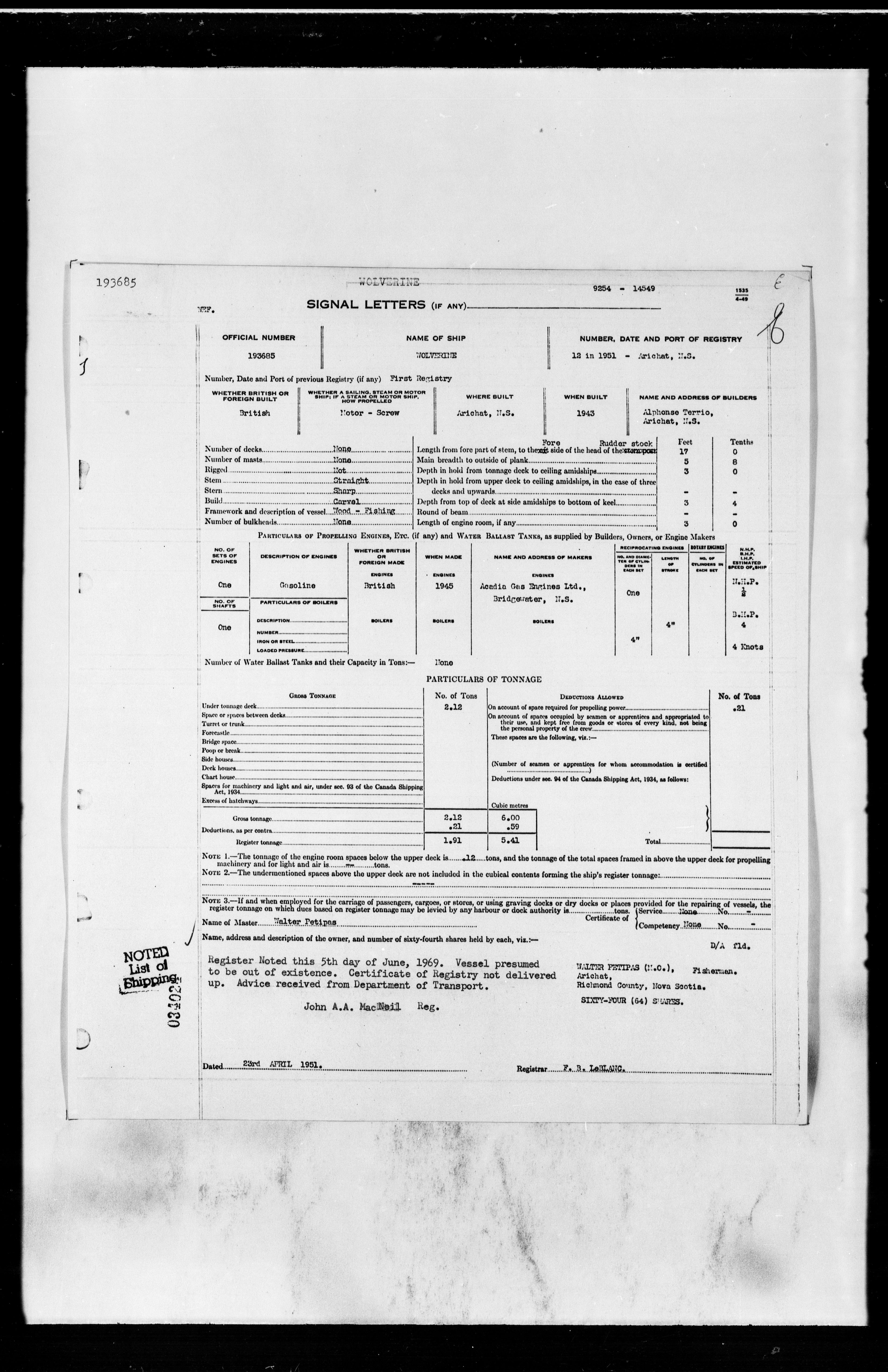 Department of Transport : Registers and ledgers cards of ships closed-out (1904-1983) - 11928