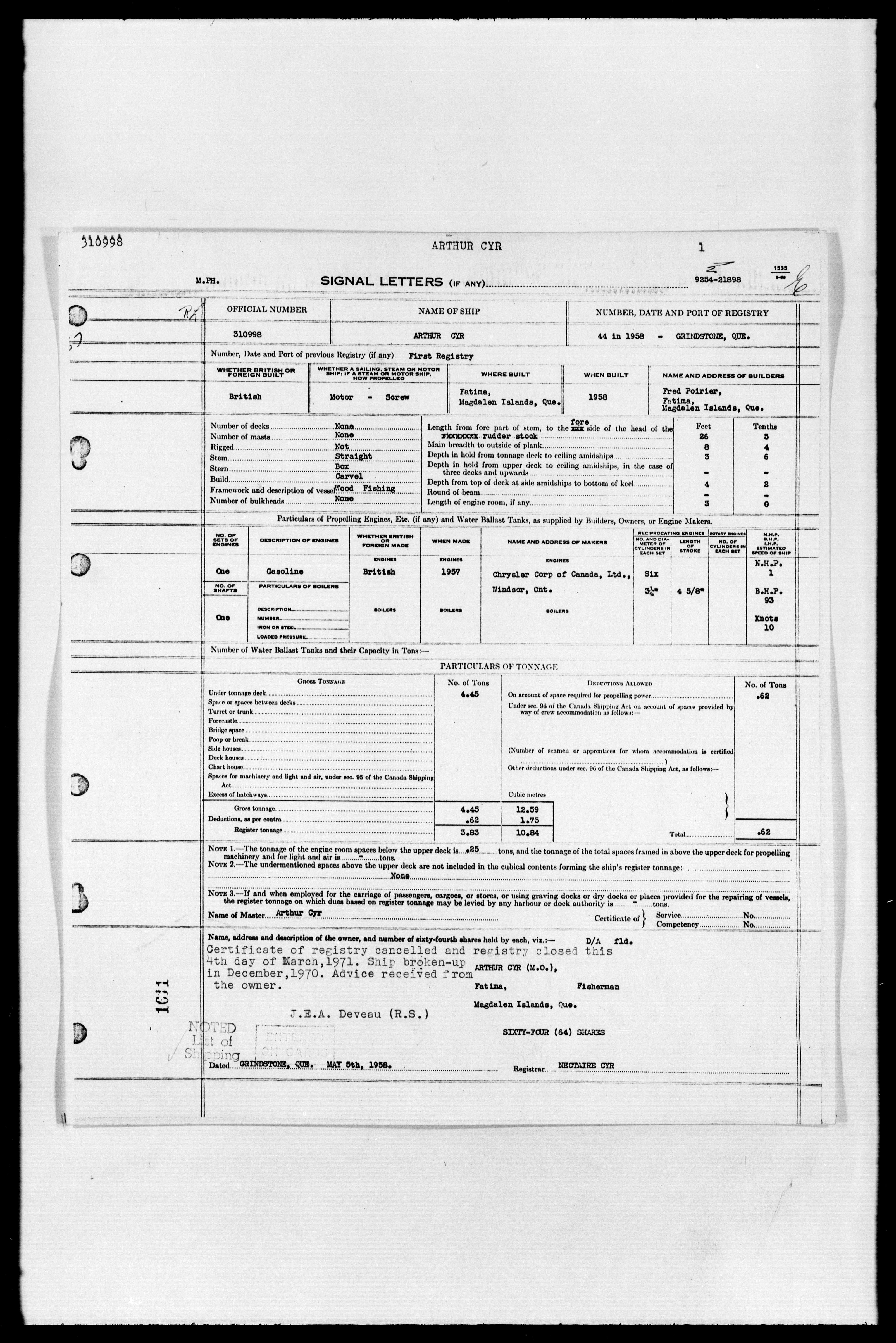 Department of Transport : Registers and ledgers cards of ships closed-out (1904-1983) - 11930