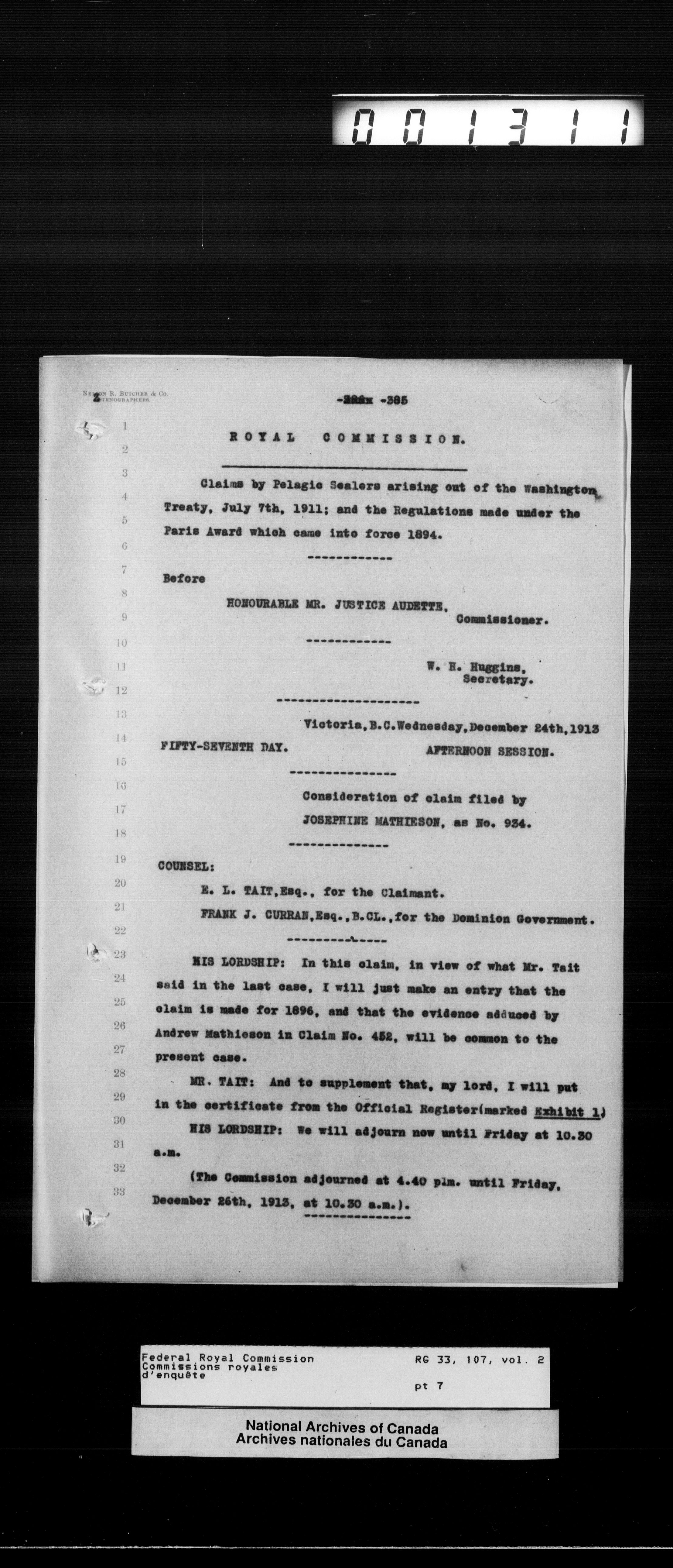Commission to Investigate into and Report upon Claims of certain Canadian Pelagic Sealers Alleged to have been damnified by reason of the Pelagic Sealing Treaty of the 7th July, 1911 between Great Britain and the United States, Russia, and Japan, and by the Paris Award Regulations of 1893 fonds : T-12049