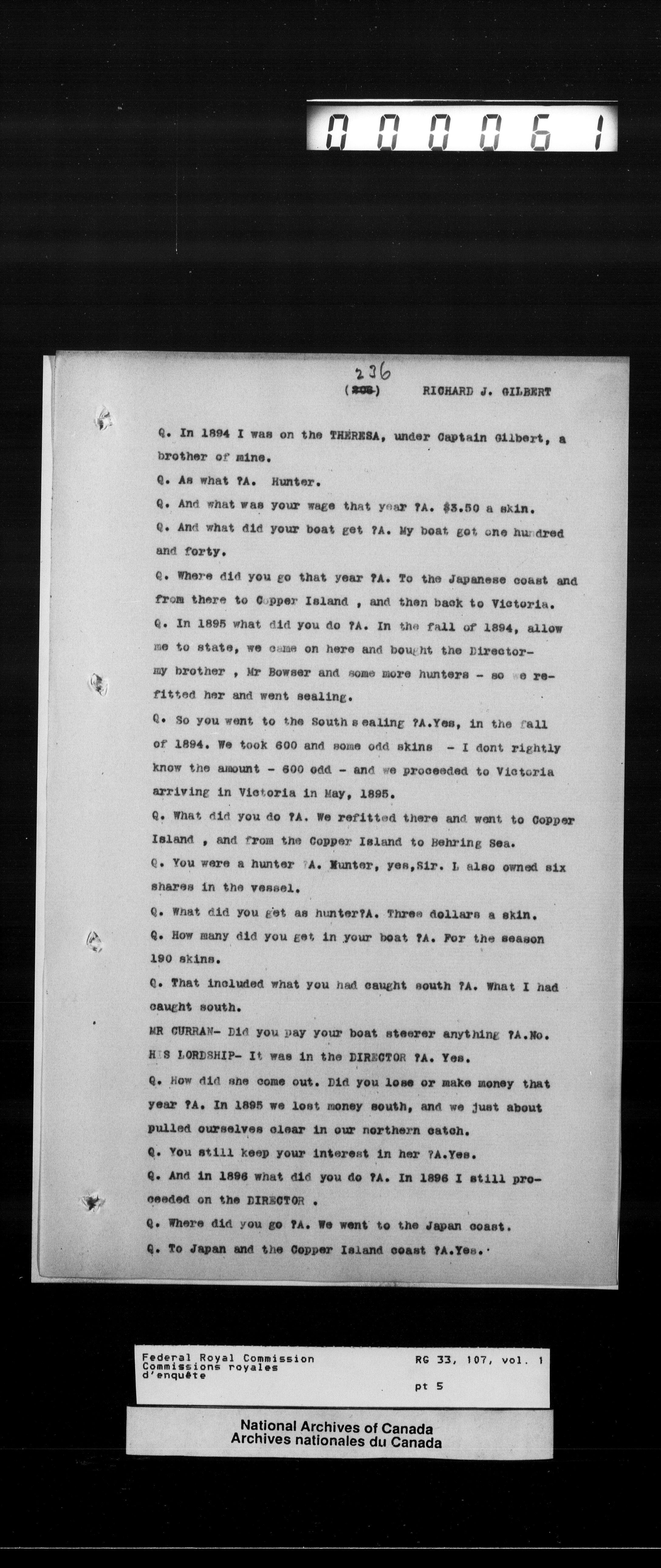 Commission to Investigate into and Report upon Claims of certain Canadian Pelagic Sealers Alleged to have been damnified by reason of the Pelagic Sealing Treaty of the 7th July, 1911 between Great Britain and the United States, Russia, and Japan, and by the Paris Award Regulations of 1893 - T-12049