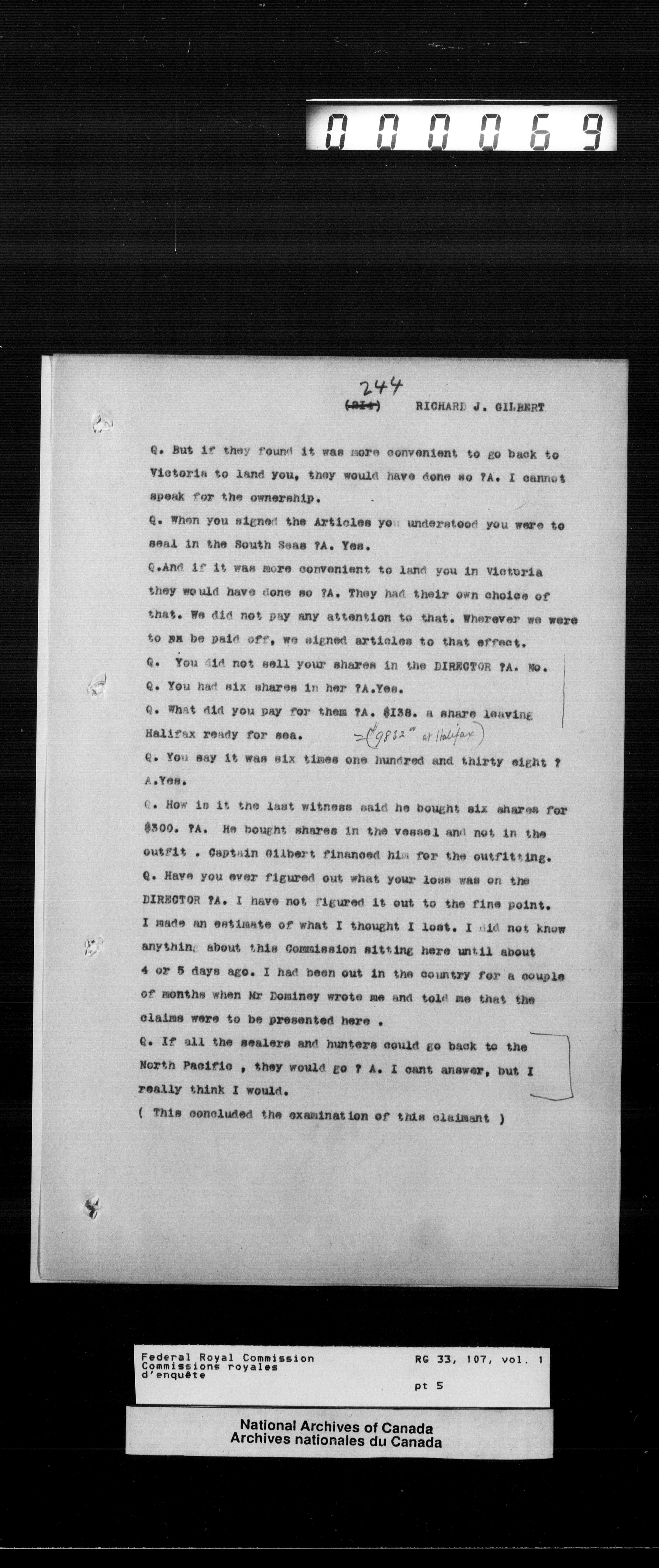 Commission to Investigate into and Report upon Claims of certain Canadian Pelagic Sealers Alleged to have been damnified by reason of the Pelagic Sealing Treaty of the 7th July, 1911 between Great Britain and the United States, Russia, and Japan, and by the Paris Award Regulations of 1893 - T-12049