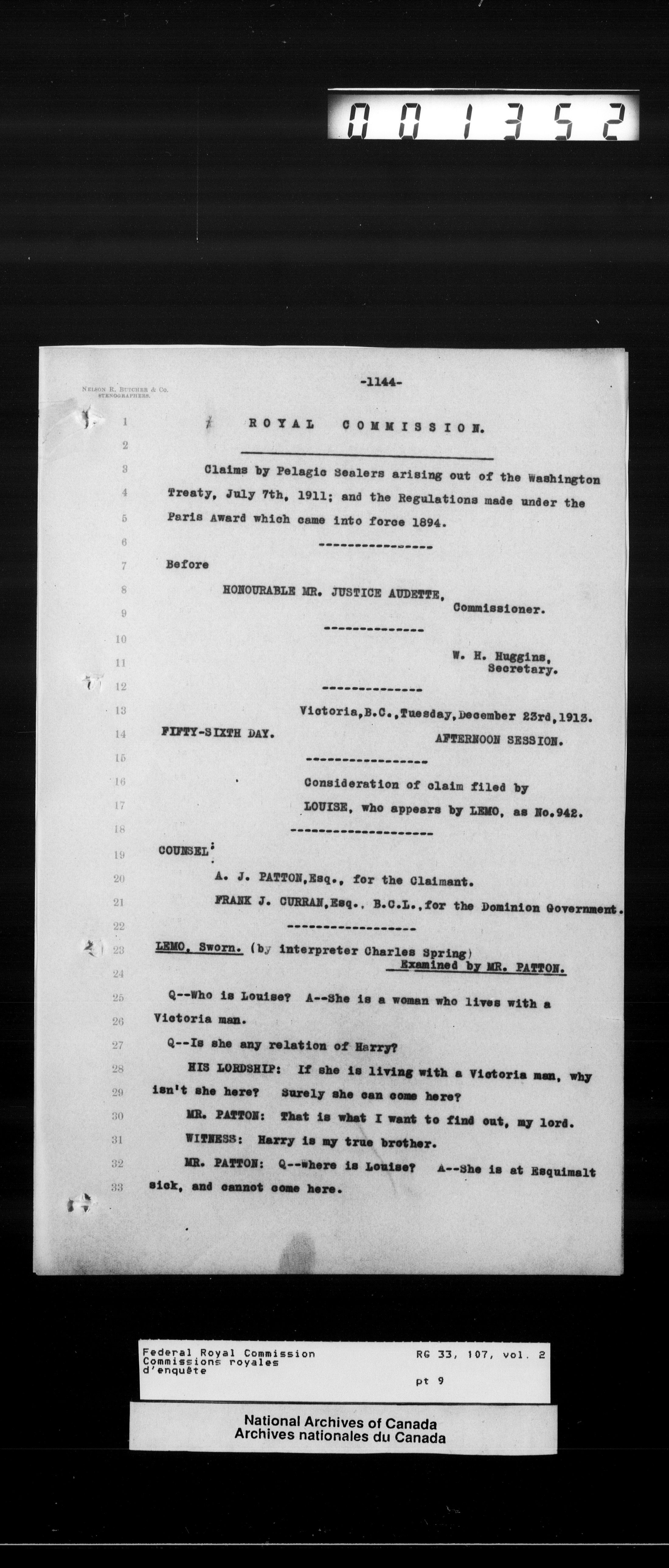 Commission to Investigate into and Report upon Claims of certain Canadian Pelagic Sealers Alleged to have been damnified by reason of the Pelagic Sealing Treaty of the 7th July, 1911 between Great Britain and the United States, Russia, and Japan, and by the Paris Award Regulations of 1893 - 12050