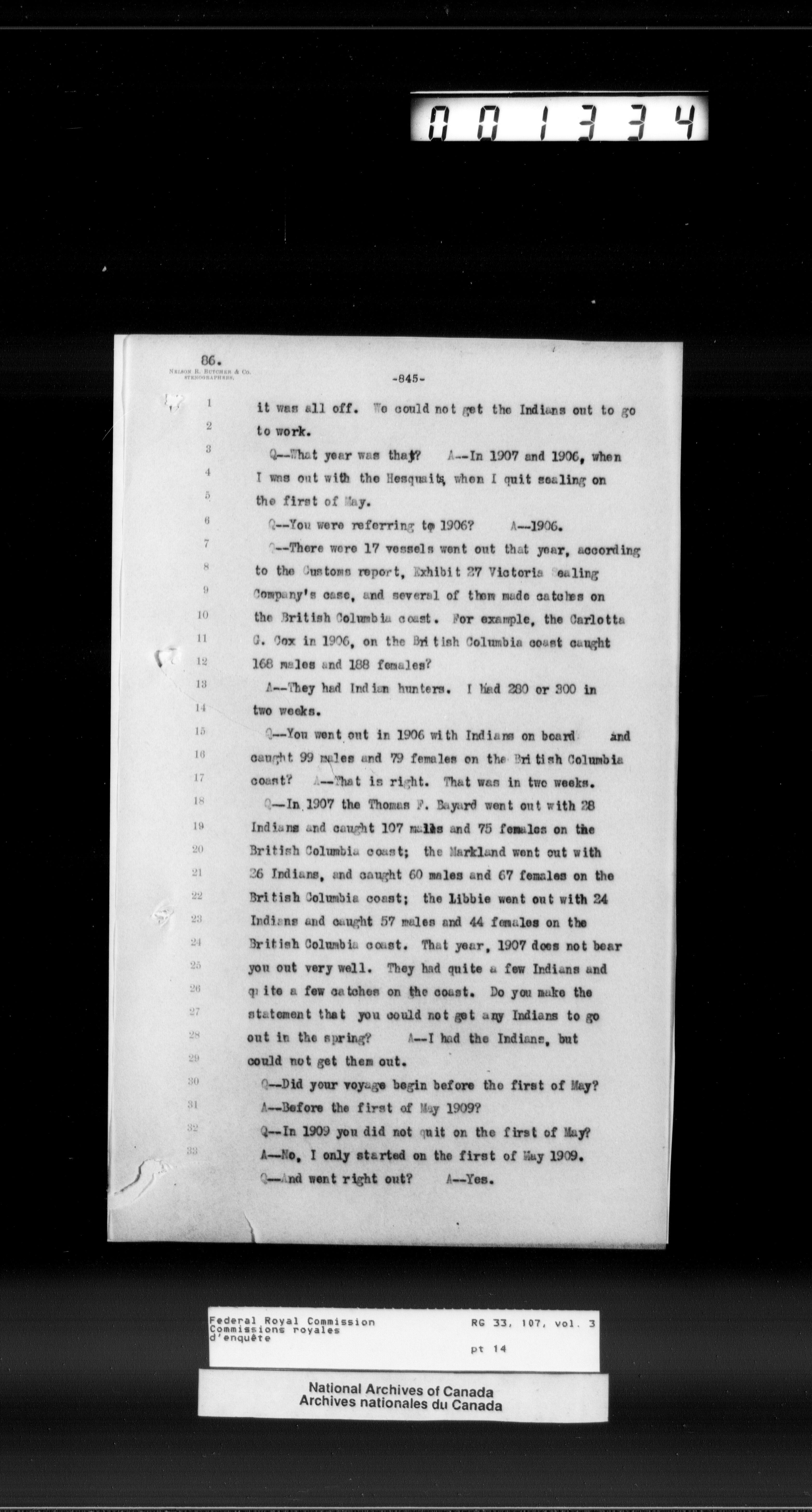 Commission to Investigate into and Report upon Claims of certain Canadian Pelagic Sealers Alleged to have been damnified by reason of the Pelagic Sealing Treaty of the 7th July, 1911 between Great Britain and the United States, Russia, and Japan, and by the Paris Award Regulations of 1893 fonds : T-12052