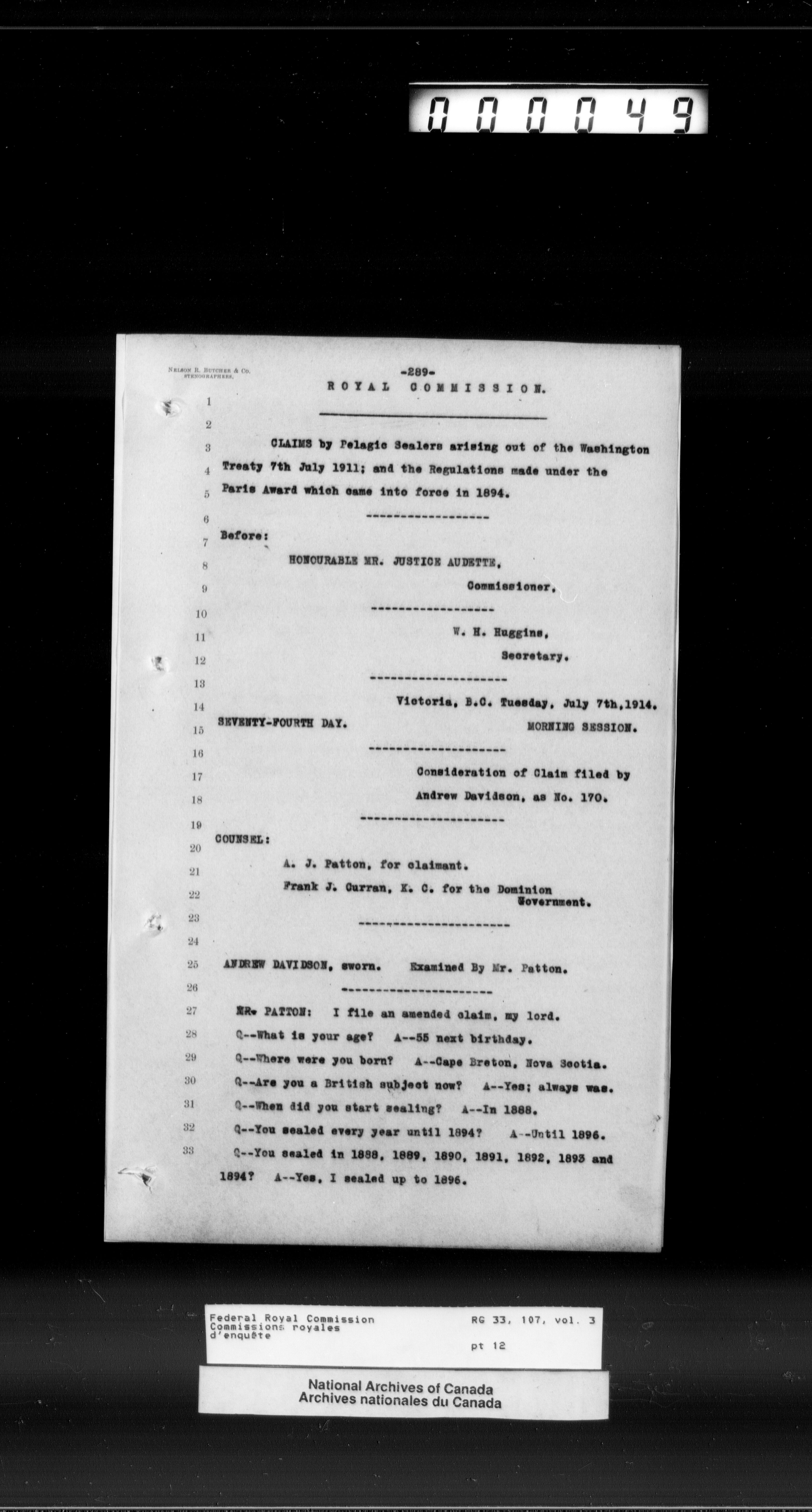Commission to Investigate into and Report upon Claims of certain Canadian Pelagic Sealers Alleged to have been damnified by reason of the Pelagic Sealing Treaty of the 7th July, 1911 between Great Britain and the United States, Russia, and Japan, and by the Paris Award Regulations of 1893 - T-12052