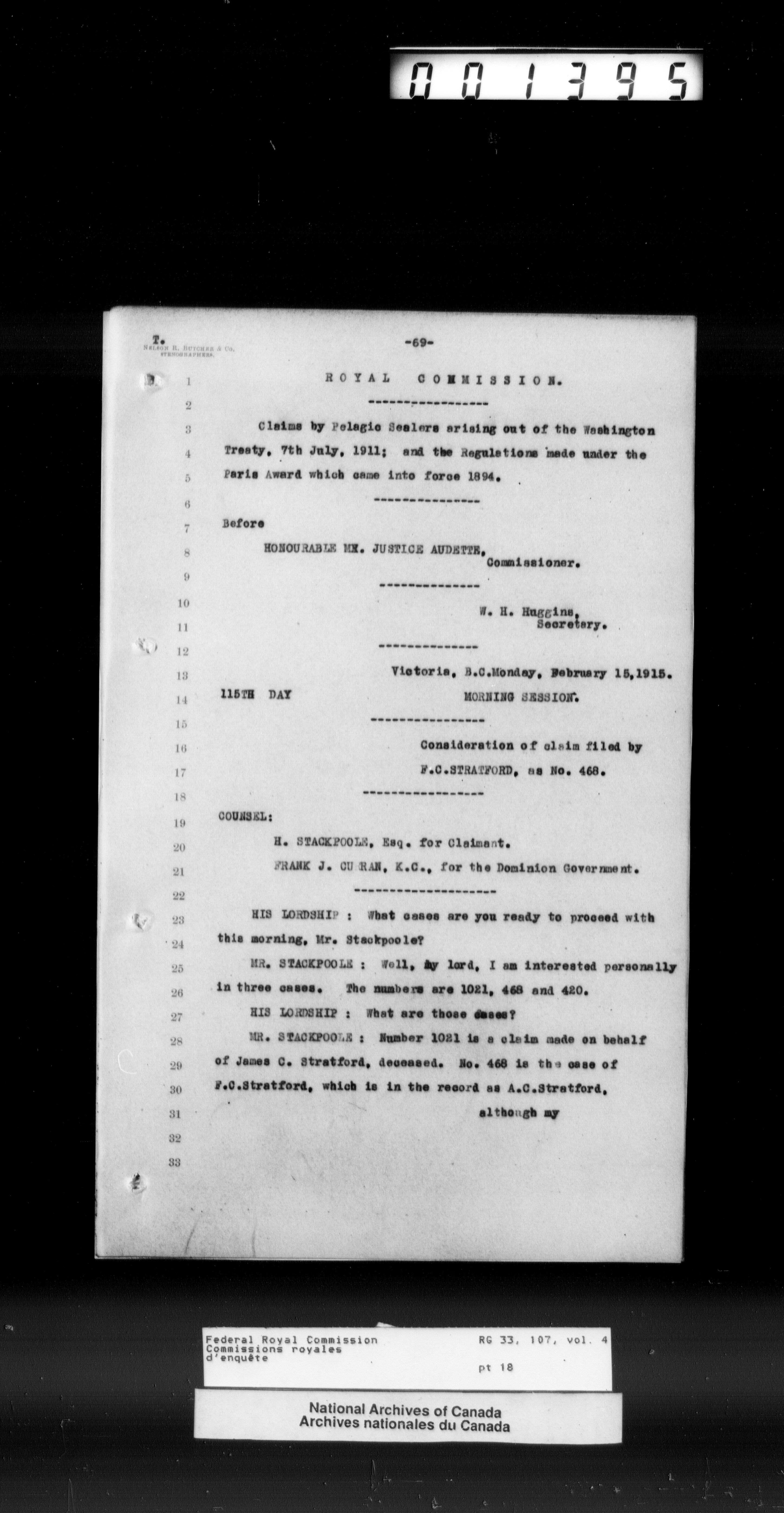 Commission to Investigate into and Report upon Claims of certain Canadian Pelagic Sealers Alleged to have been damnified by reason of the Pelagic Sealing Treaty of the 7th July, 1911 between Great Britain and the United States, Russia, and Japan, and by the Paris Award Regulations of 1893 - T-12053