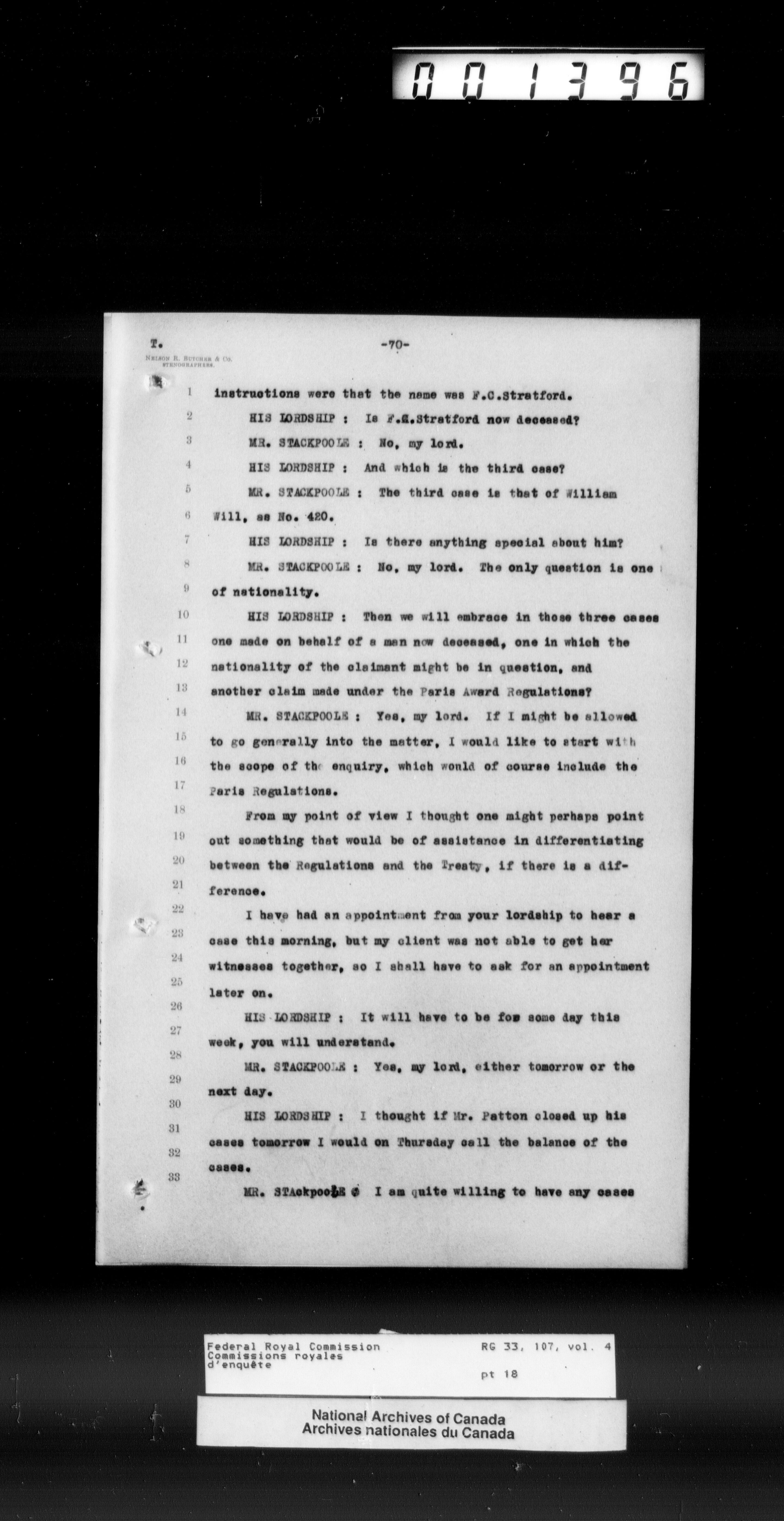 Commission to Investigate into and Report upon Claims of certain Canadian Pelagic Sealers Alleged to have been damnified by reason of the Pelagic Sealing Treaty of the 7th July, 1911 between Great Britain and the United States, Russia, and Japan, and by the Paris Award Regulations of 1893 - T-12053