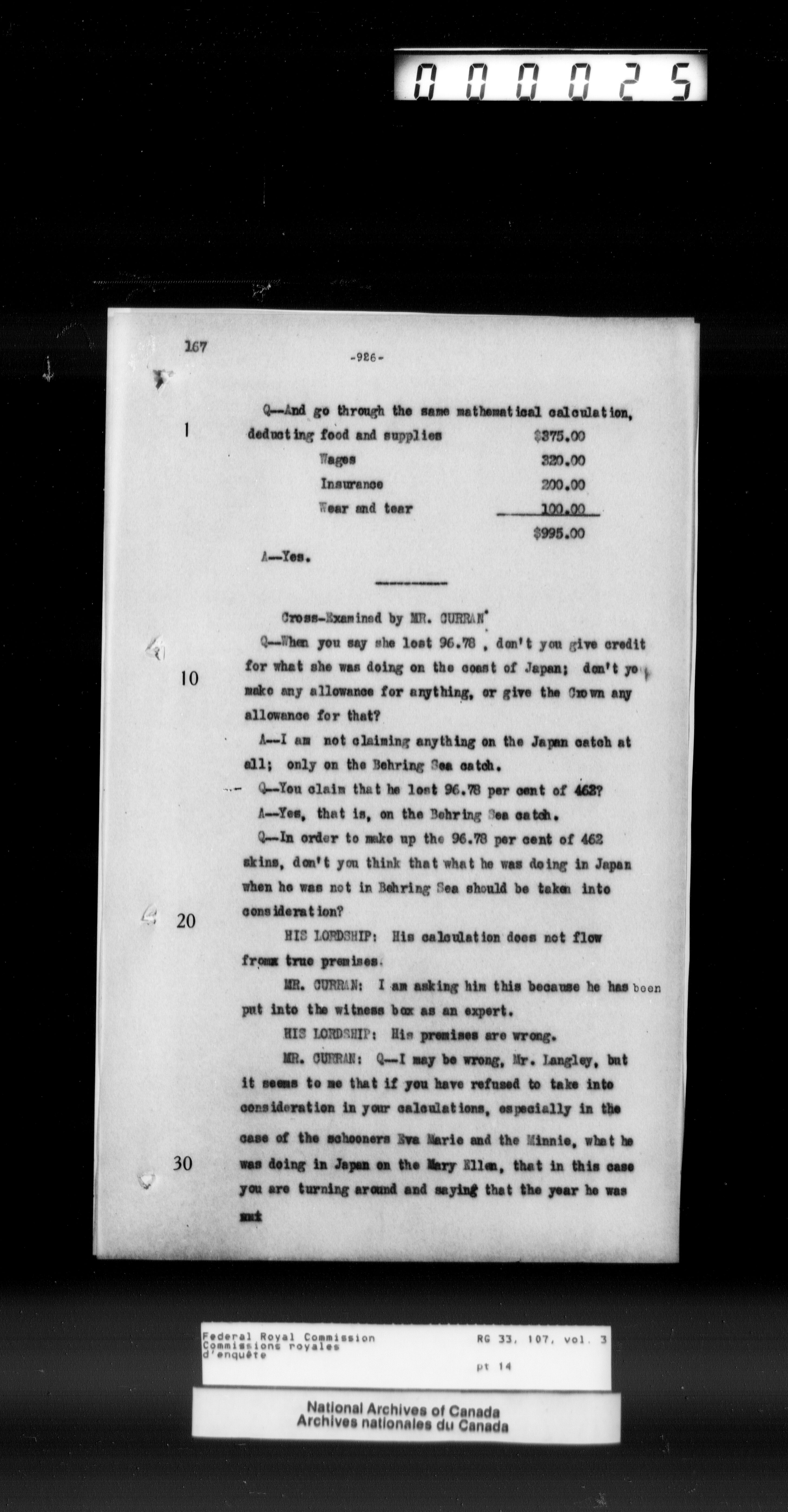 Commission to Investigate into and Report upon Claims of certain Canadian Pelagic Sealers Alleged to have been damnified by reason of the Pelagic Sealing Treaty of the 7th July, 1911 between Great Britain and the United States, Russia, and Japan, and by the Paris Award Regulations of 1893 - T-12053