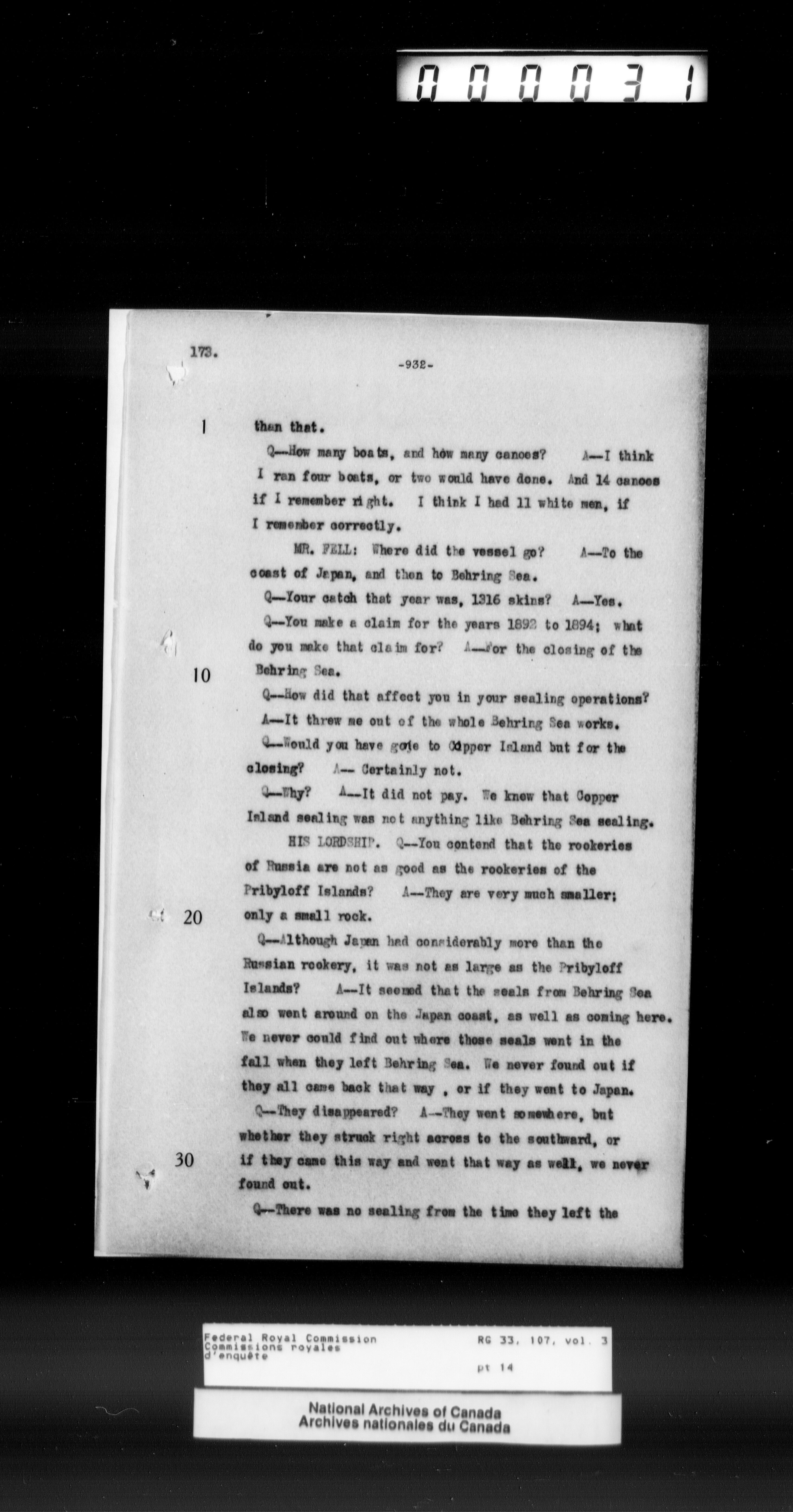 Commission to Investigate into and Report upon Claims of certain Canadian Pelagic Sealers Alleged to have been damnified by reason of the Pelagic Sealing Treaty of the 7th July, 1911 between Great Britain and the United States, Russia, and Japan, and by the Paris Award Regulations of 1893 - T-12053