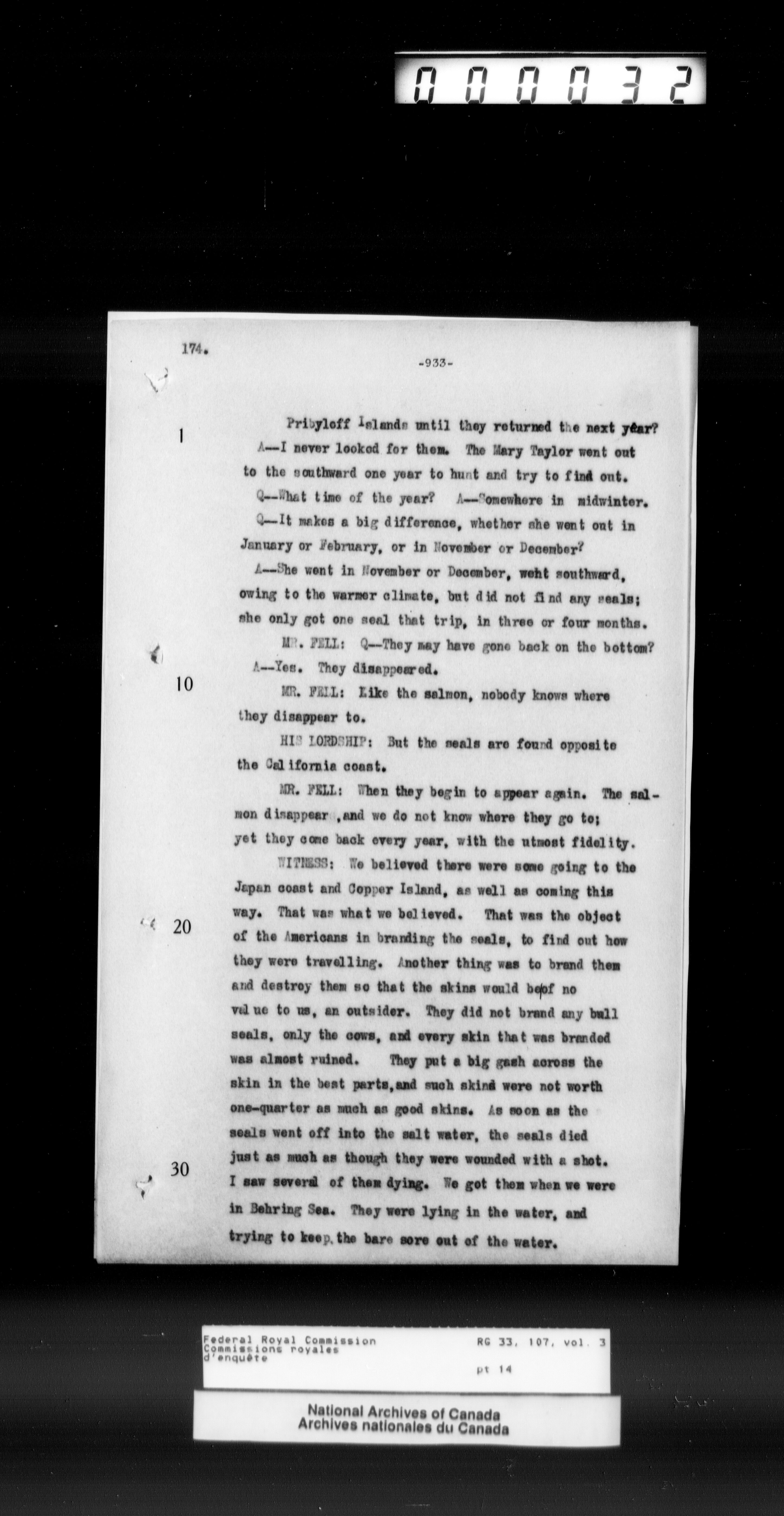 Commission to Investigate into and Report upon Claims of certain Canadian Pelagic Sealers Alleged to have been damnified by reason of the Pelagic Sealing Treaty of the 7th July, 1911 between Great Britain and the United States, Russia, and Japan, and by the Paris Award Regulations of 1893 - T-12053