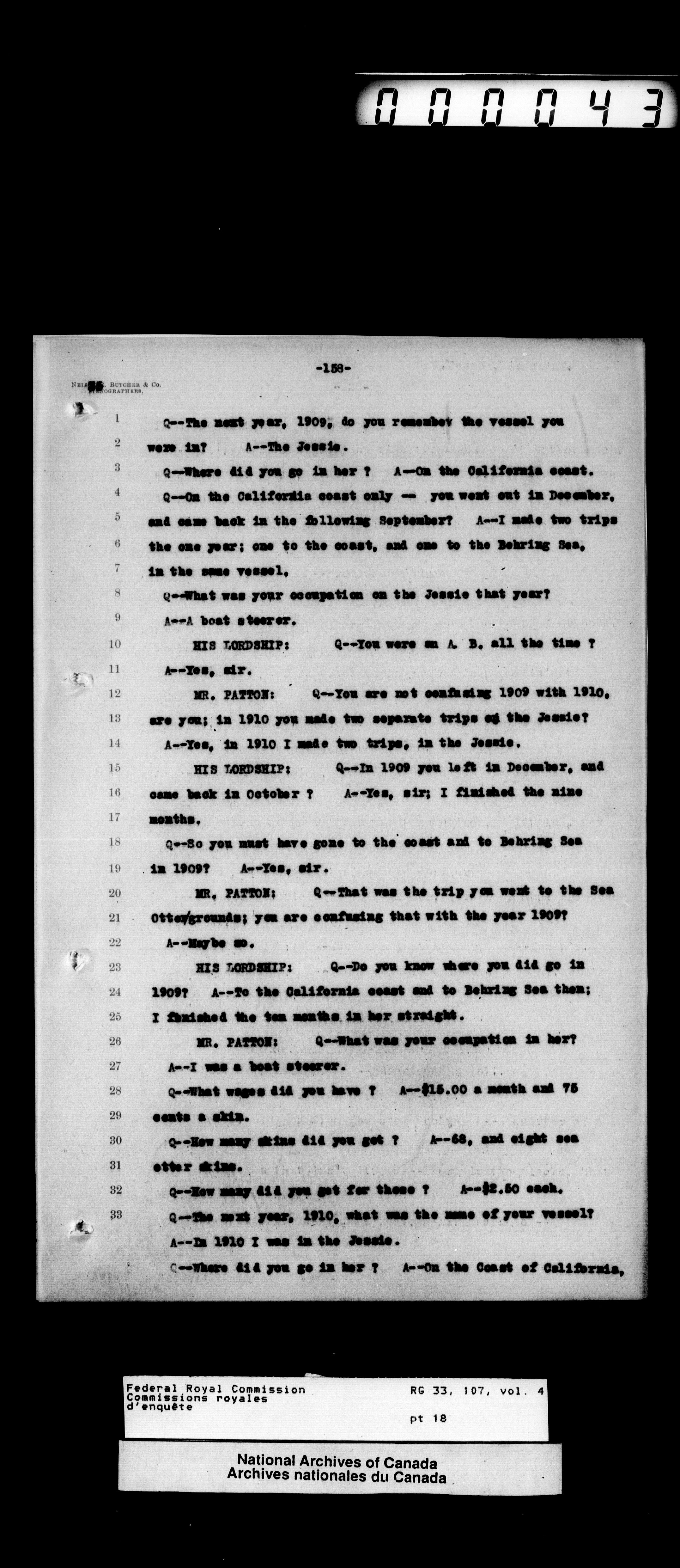 Commission to Investigate into and Report upon Claims of certain Canadian Pelagic Sealers Alleged to have been damnified by reason of the Pelagic Sealing Treaty of the 7th July, 1911 between Great Britain and the United States, Russia, and Japan, and by the Paris Award Regulations of 1893 - T-12358