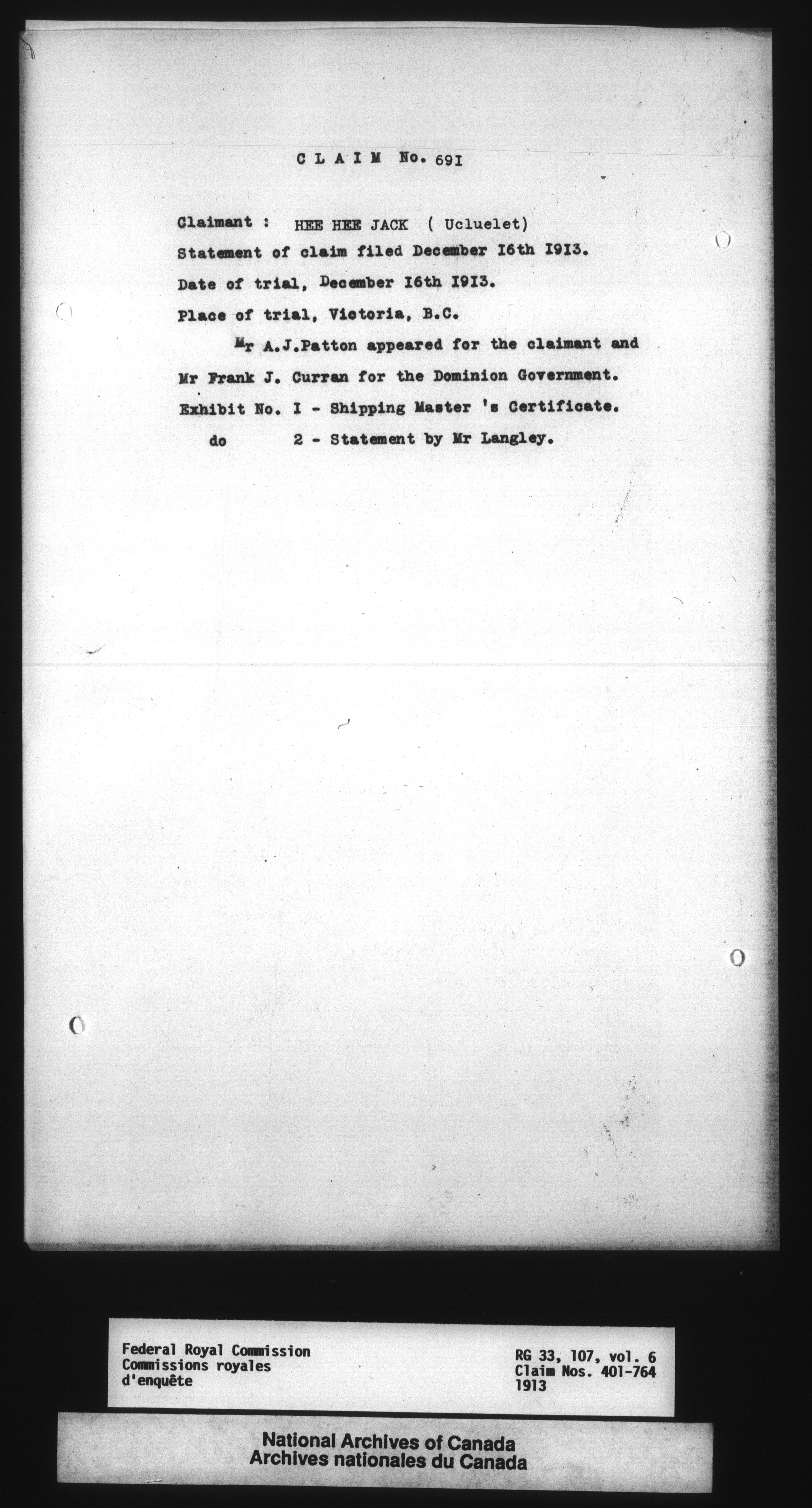 Commission to Investigate into and Report upon Claims of certain Canadian Pelagic Sealers Alleged to have been damnified by reason of the Pelagic Sealing Treaty of the 7th July, 1911 between Great Britain and the United States, Russia, and Japan, and by the Paris Award Regulations of 1893 - 12361