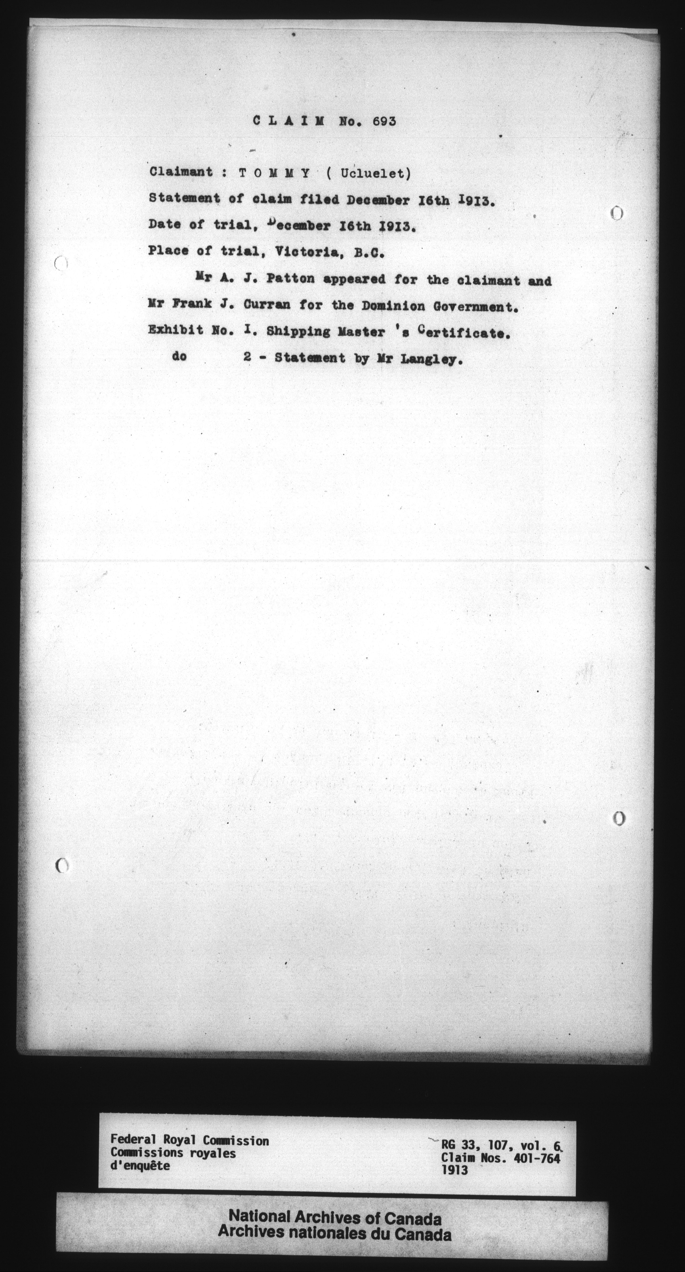 Commission to Investigate into and Report upon Claims of certain Canadian Pelagic Sealers Alleged to have been damnified by reason of the Pelagic Sealing Treaty of the 7th July, 1911 between Great Britain and the United States, Russia, and Japan, and by the Paris Award Regulations of 1893 - 12361