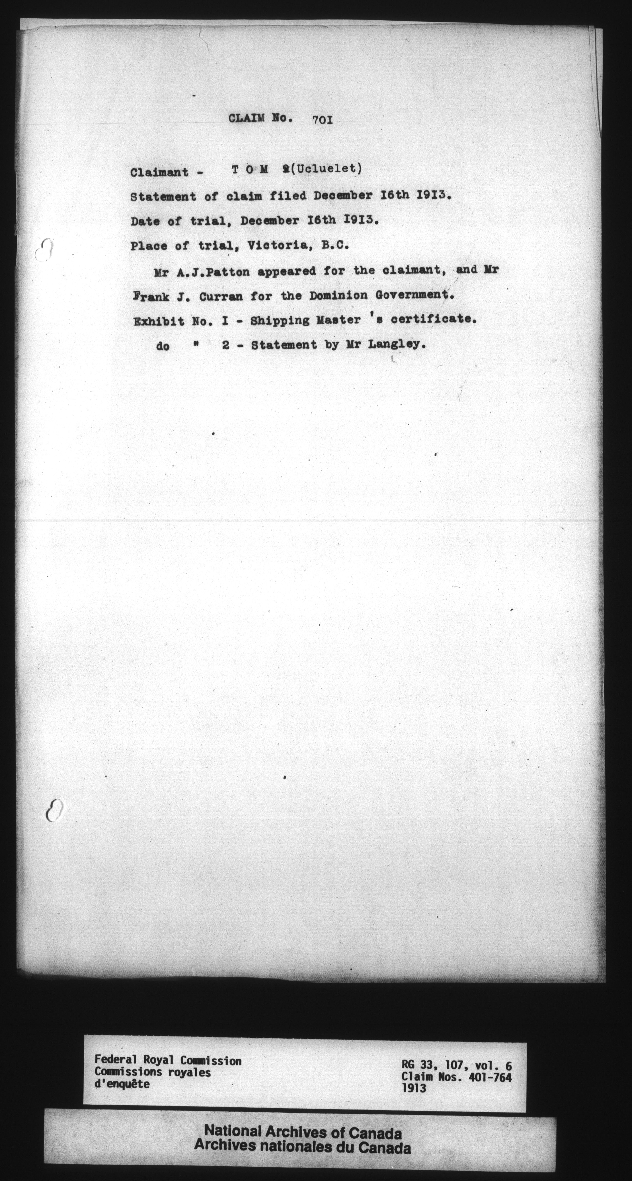 Commission to Investigate into and Report upon Claims of certain Canadian Pelagic Sealers Alleged to have been damnified by reason of the Pelagic Sealing Treaty of the 7th July, 1911 between Great Britain and the United States, Russia, and Japan, and by the Paris Award Regulations of 1893 - 12361