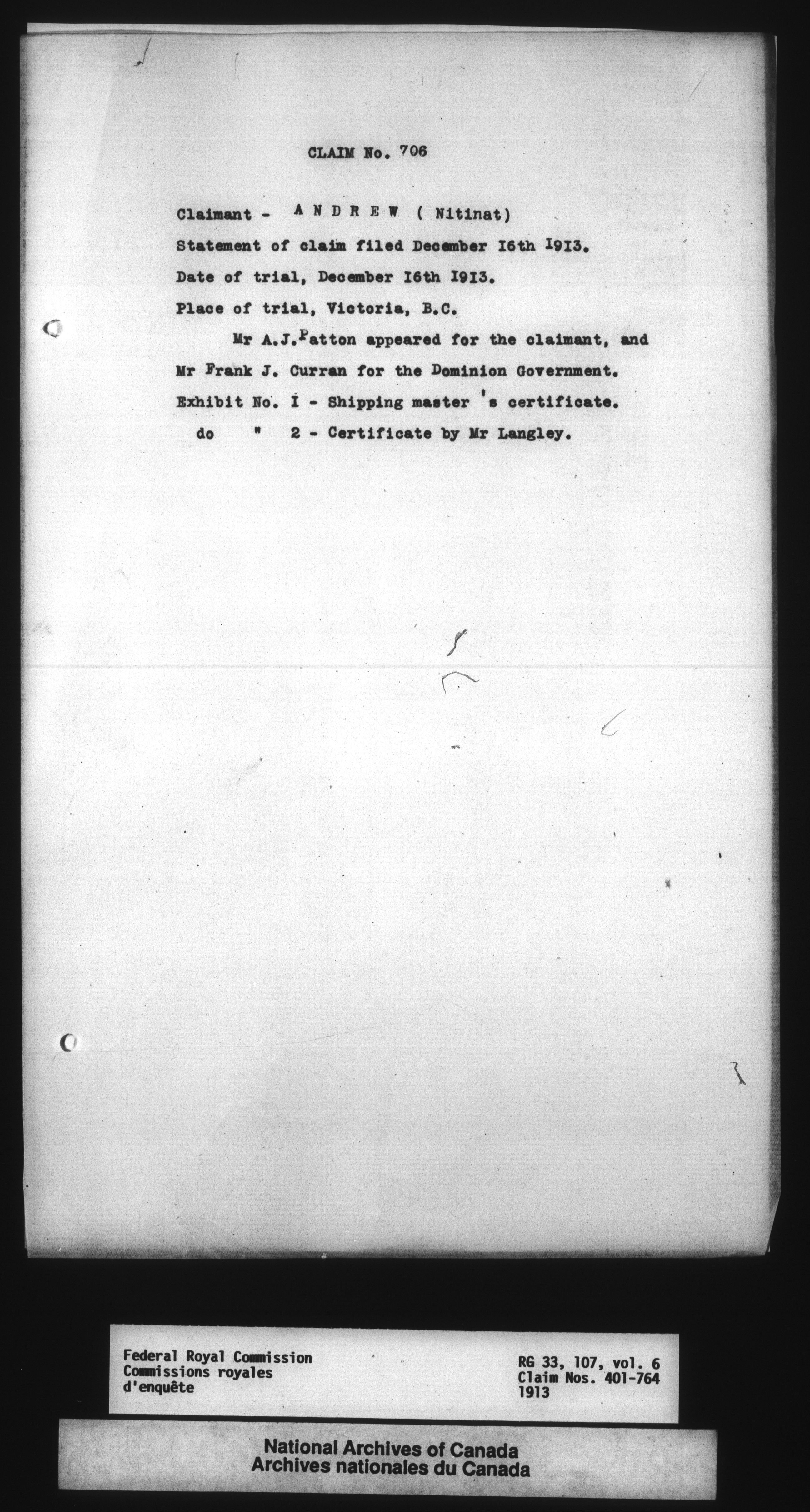 Commission to Investigate into and Report upon Claims of certain Canadian Pelagic Sealers Alleged to have been damnified by reason of the Pelagic Sealing Treaty of the 7th July, 1911 between Great Britain and the United States, Russia, and Japan, and by the Paris Award Regulations of 1893 - 12361