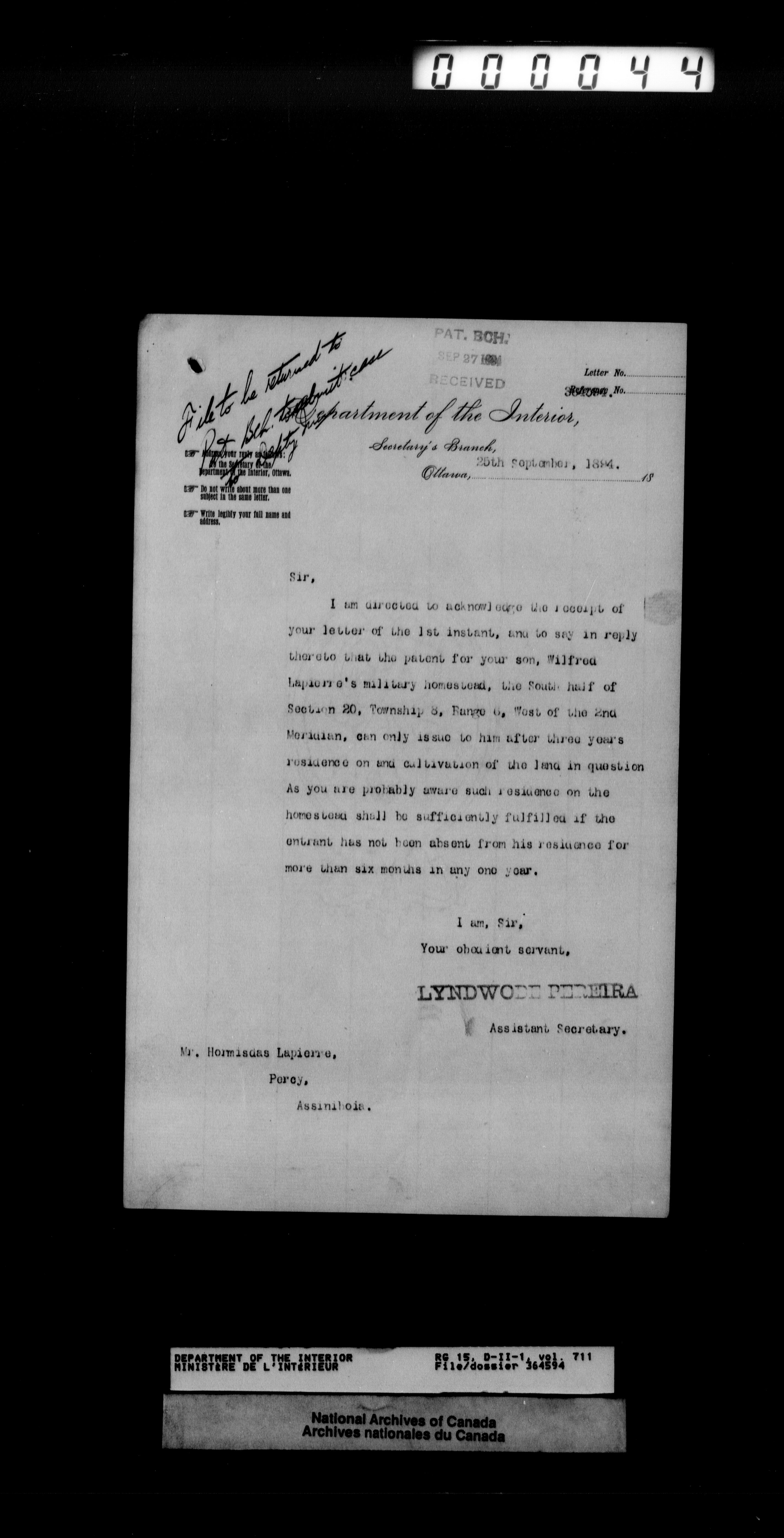 Central registry subject files created by the Dominion Lands Branch - T-12441