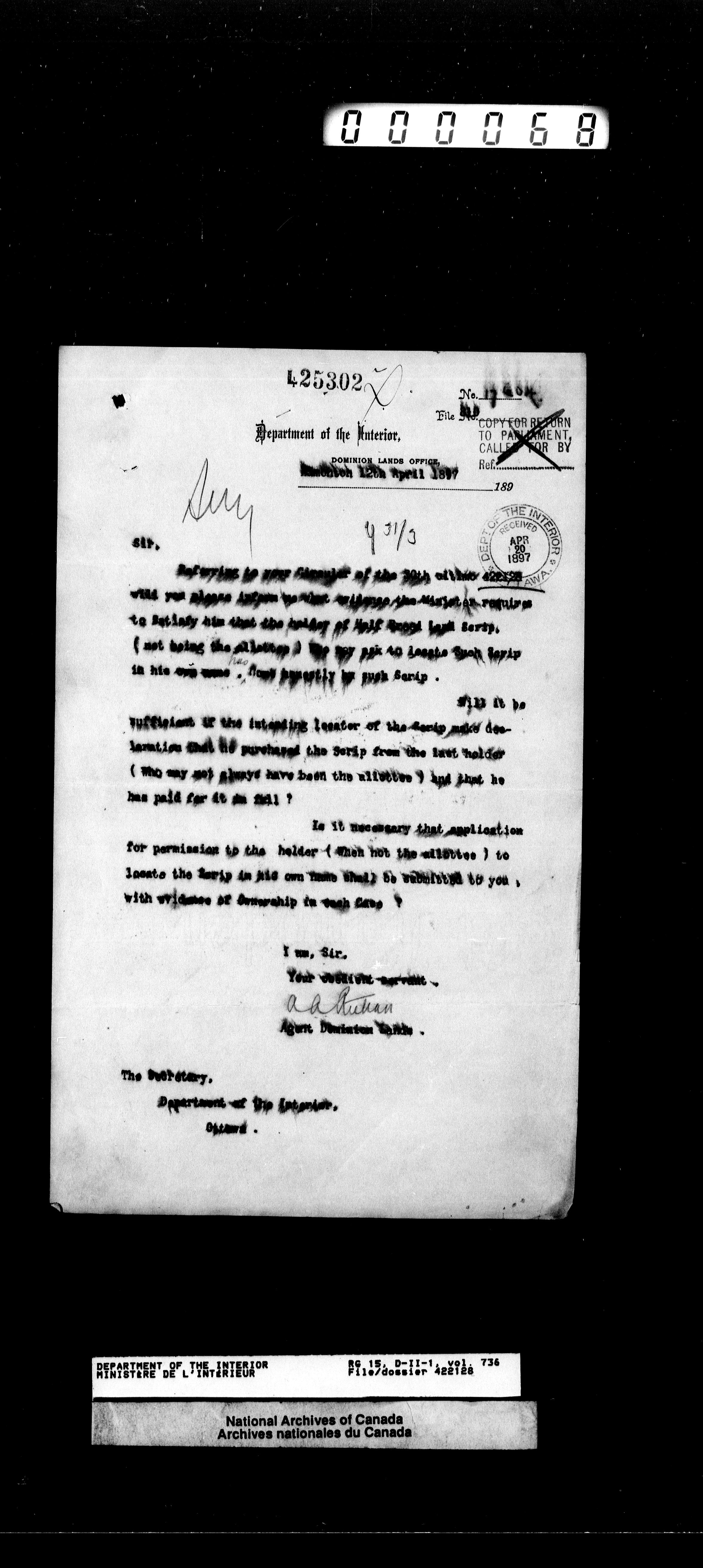 Central registry subject files created by the Dominion Lands Branch - 12486