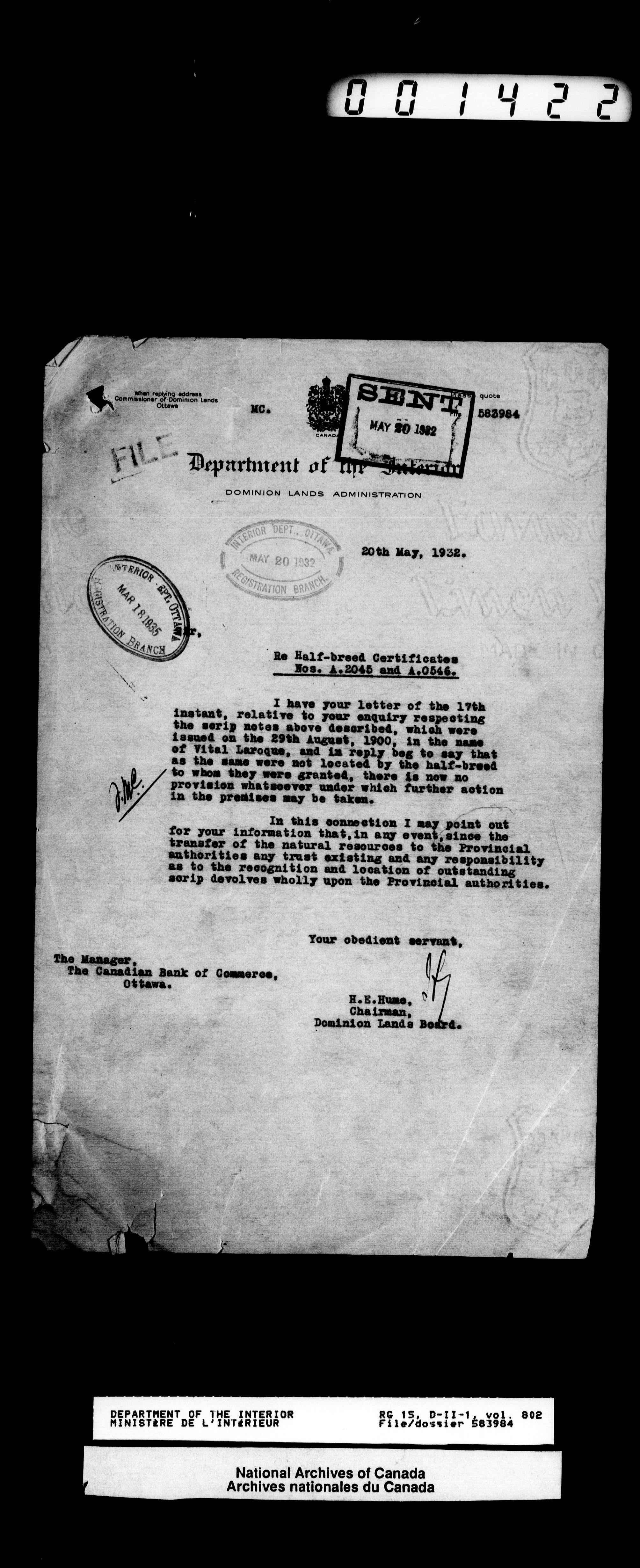 Central registry subject files created by the Dominion Lands Branch - 12629