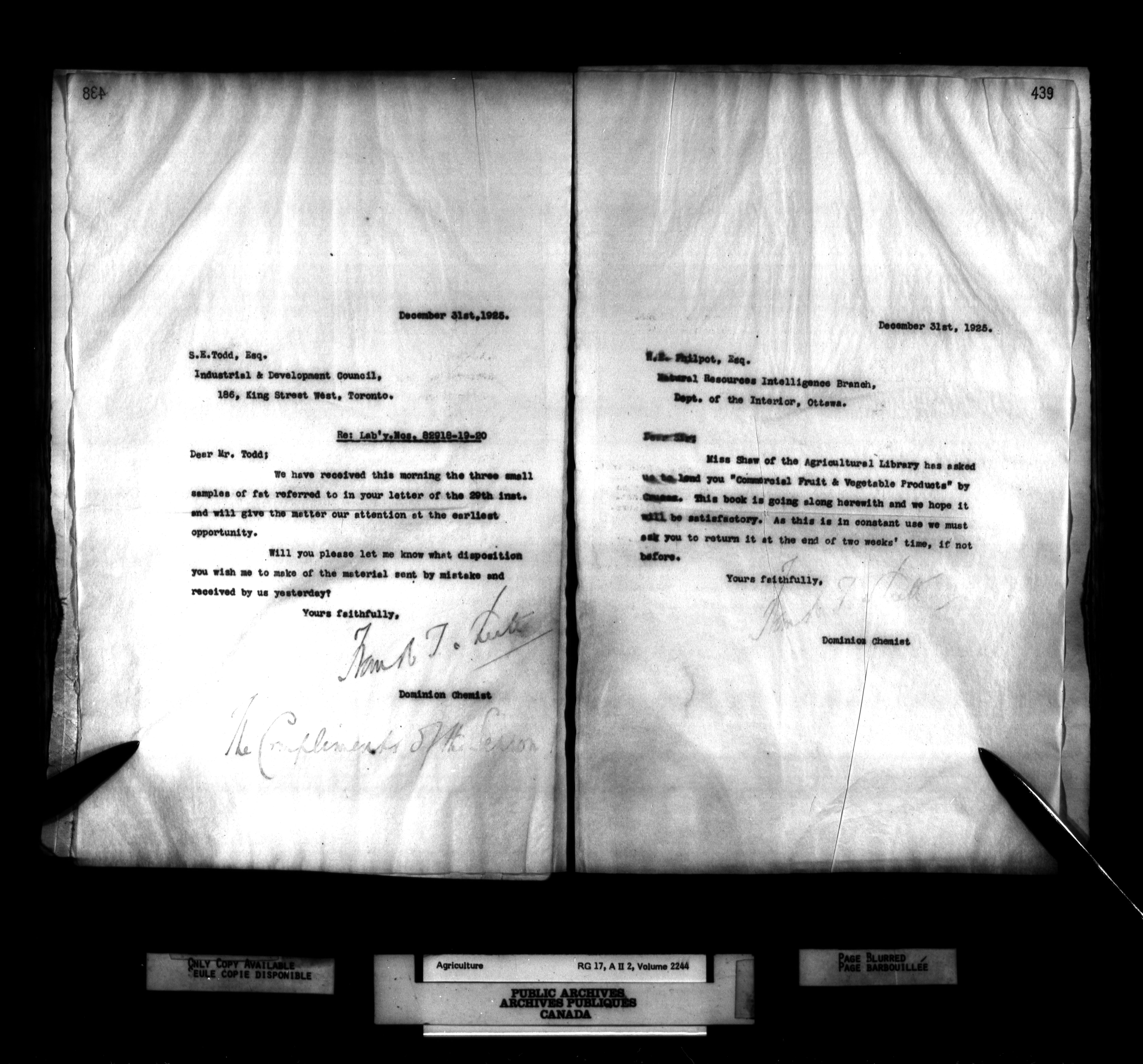Department of Agriculture, Dominion Chemist : Letterbooks, 1889 - 1933 : T-1264