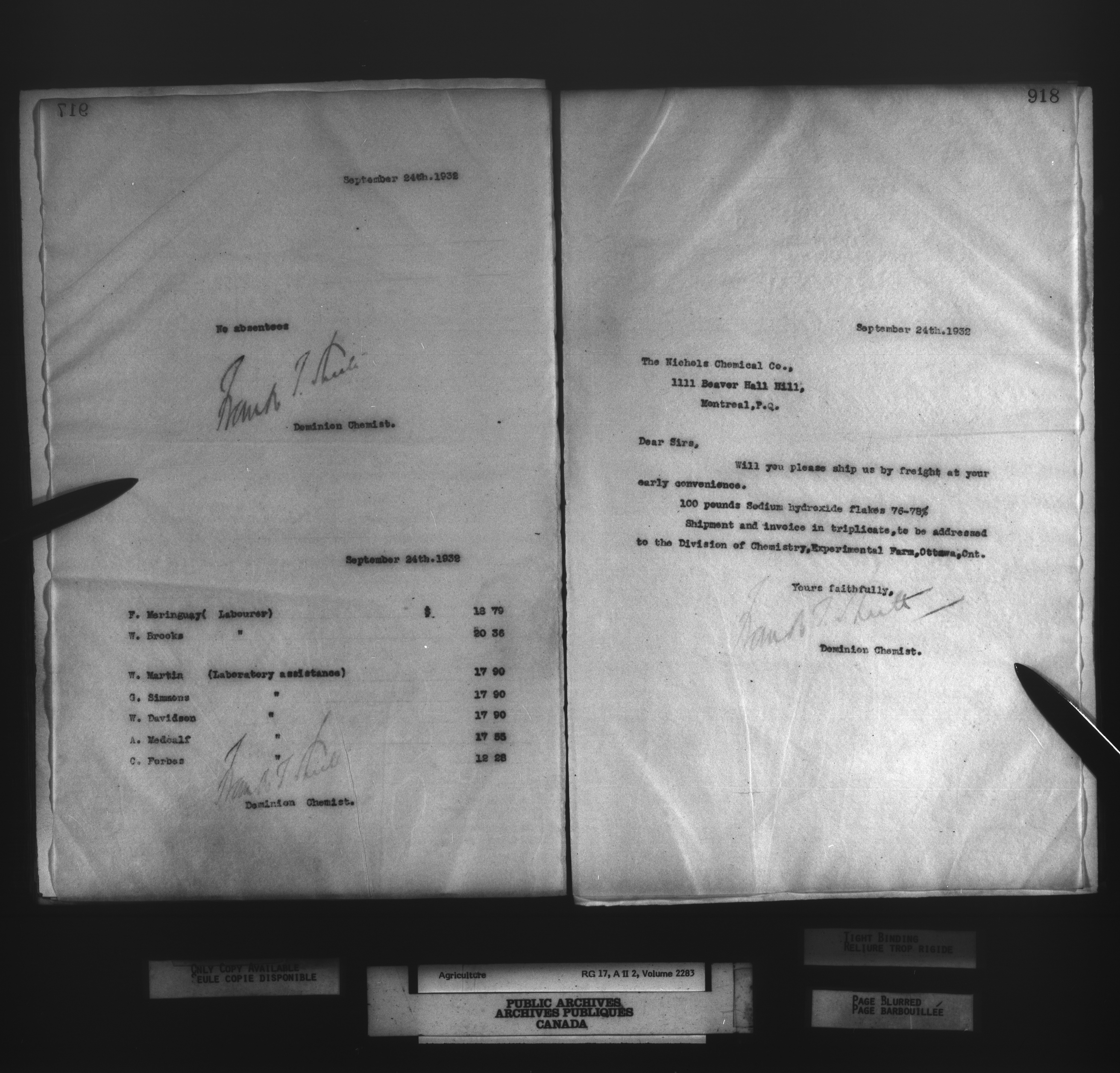 Department of Agriculture, Dominion Chemist : Letterbooks, 1889 - 1933 : T-1285