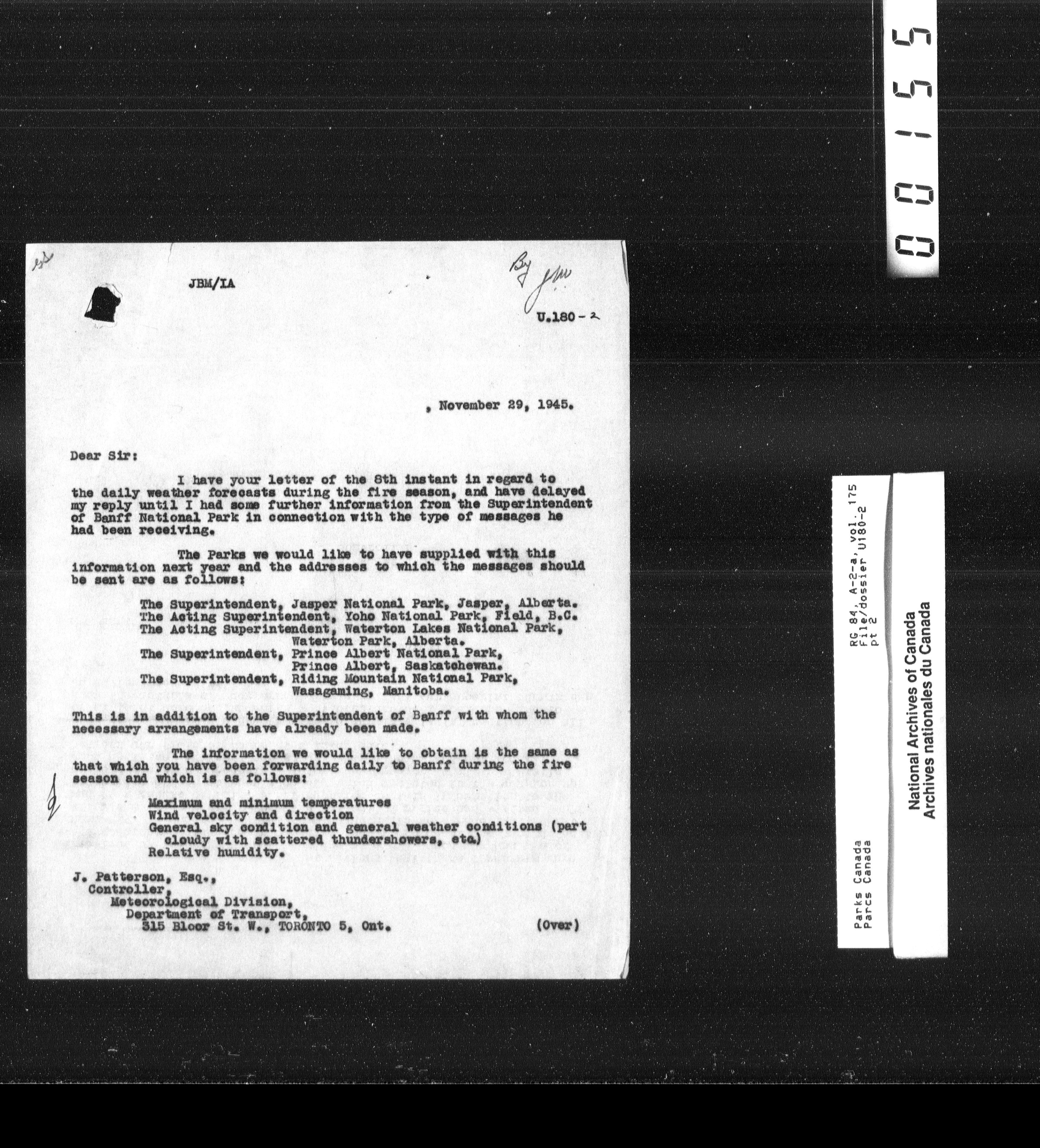 Department of Canadian Heritage, Canadian Parks Service : Park/subject classification system : T-12929