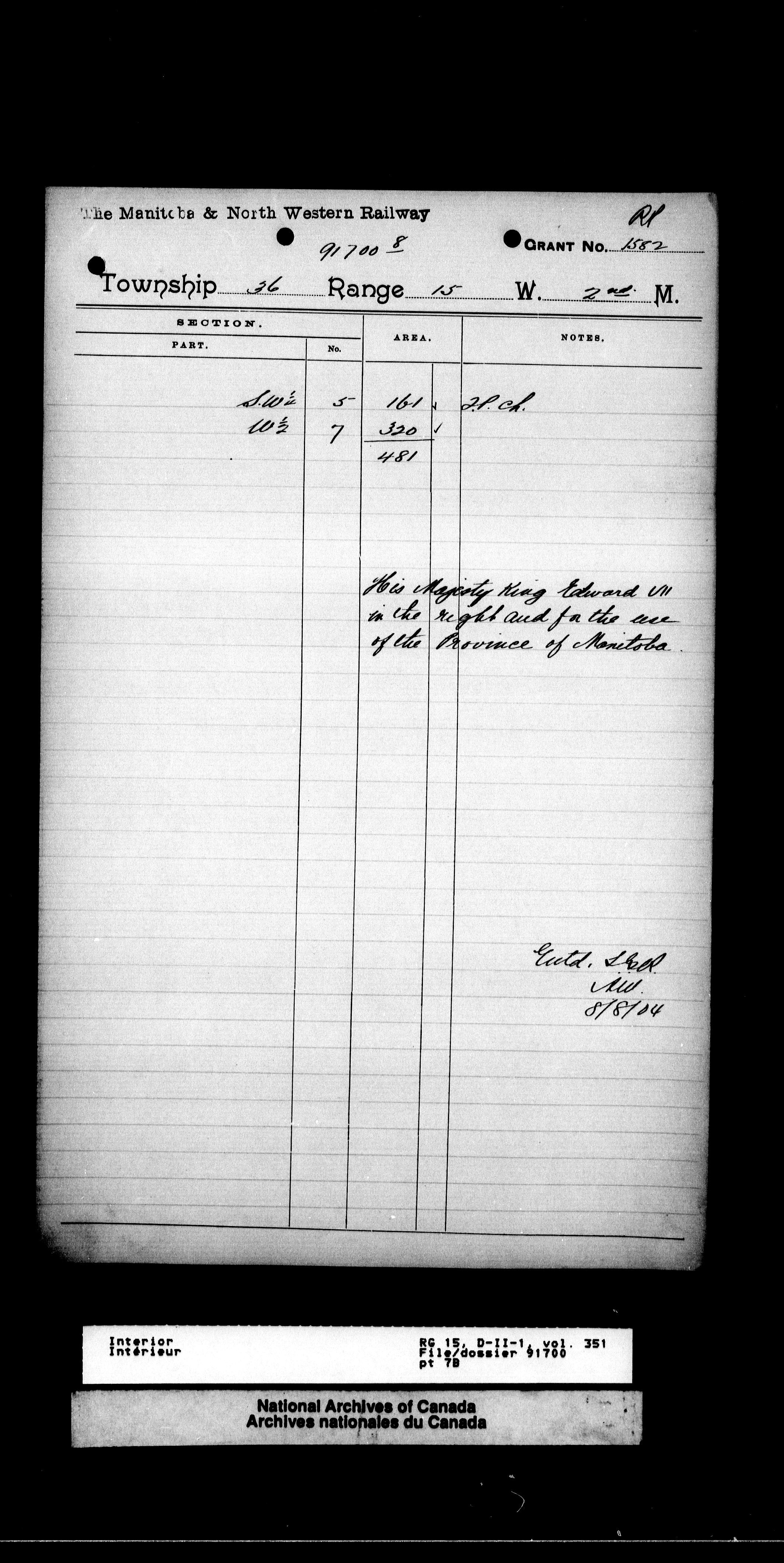 Manitoba and North-Western Railway Company, Land Patent file - 13074