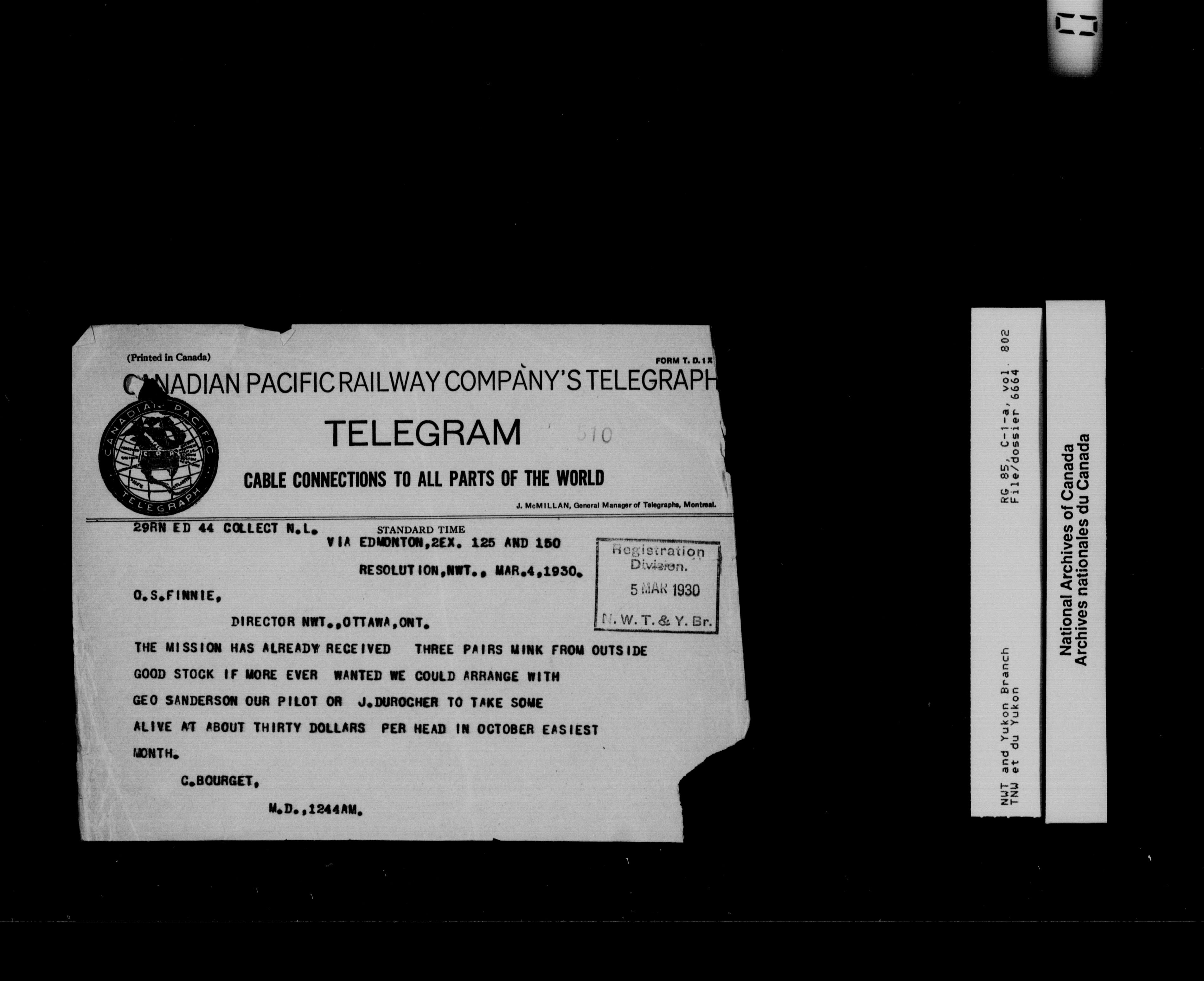 Department of Indian Affairs : Northwest Territories and Yukon Branch, Central Registry files - 13307