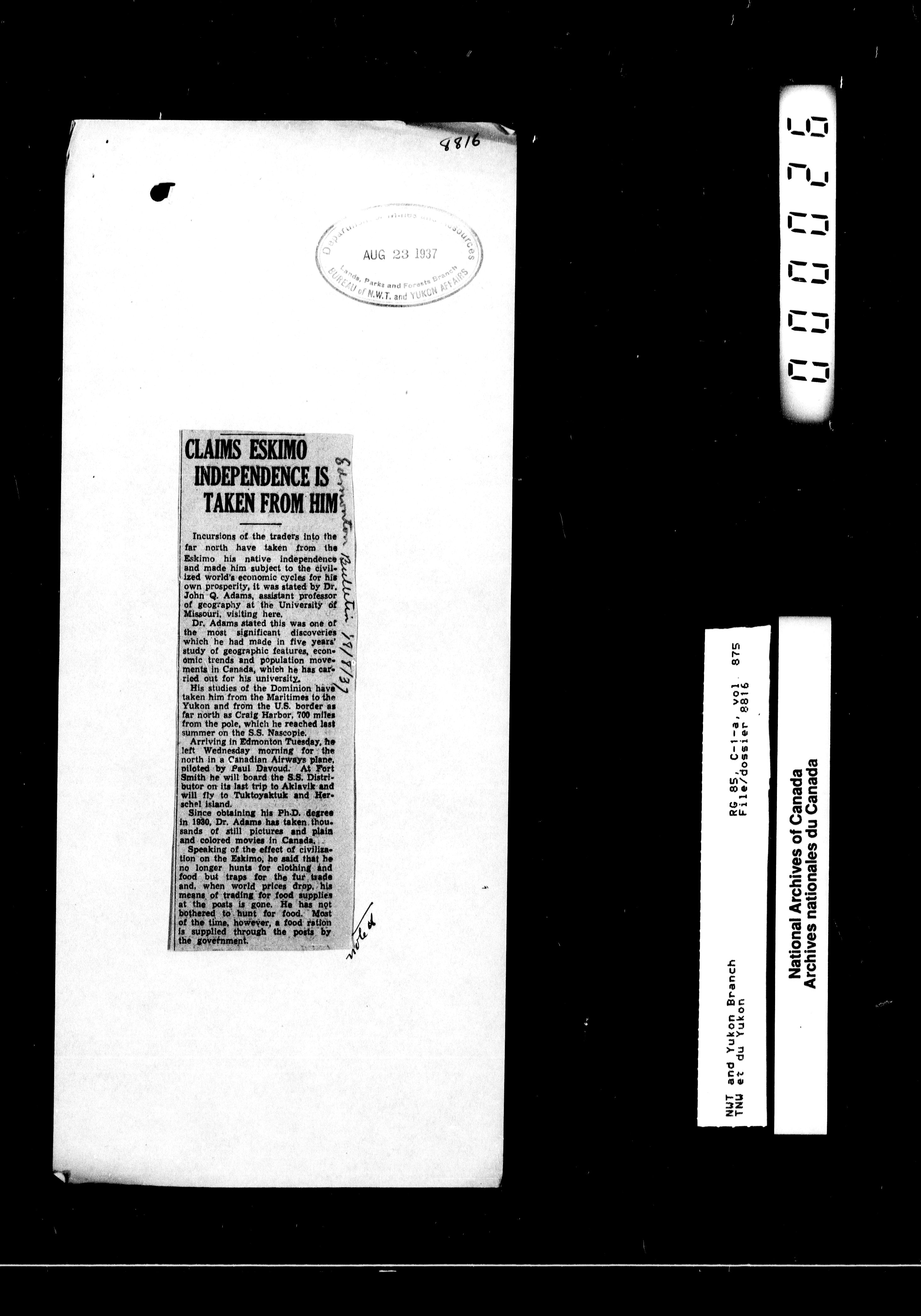 Department of Indian Affairs : Northwest Territories and Yukon Branch, Central Registry files - 13366