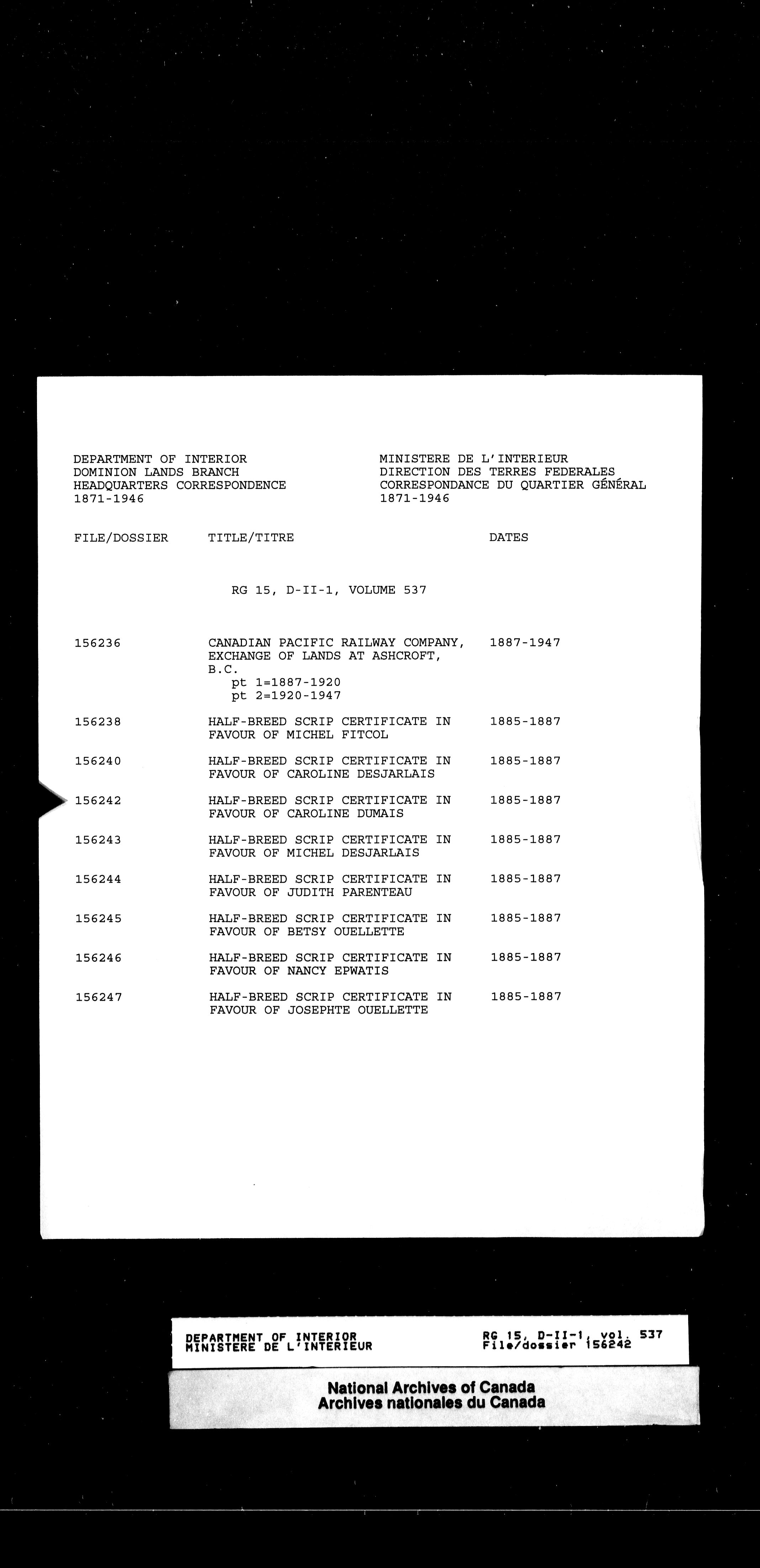 Central registry subject files created by the Dominion Lands Branch - 13796