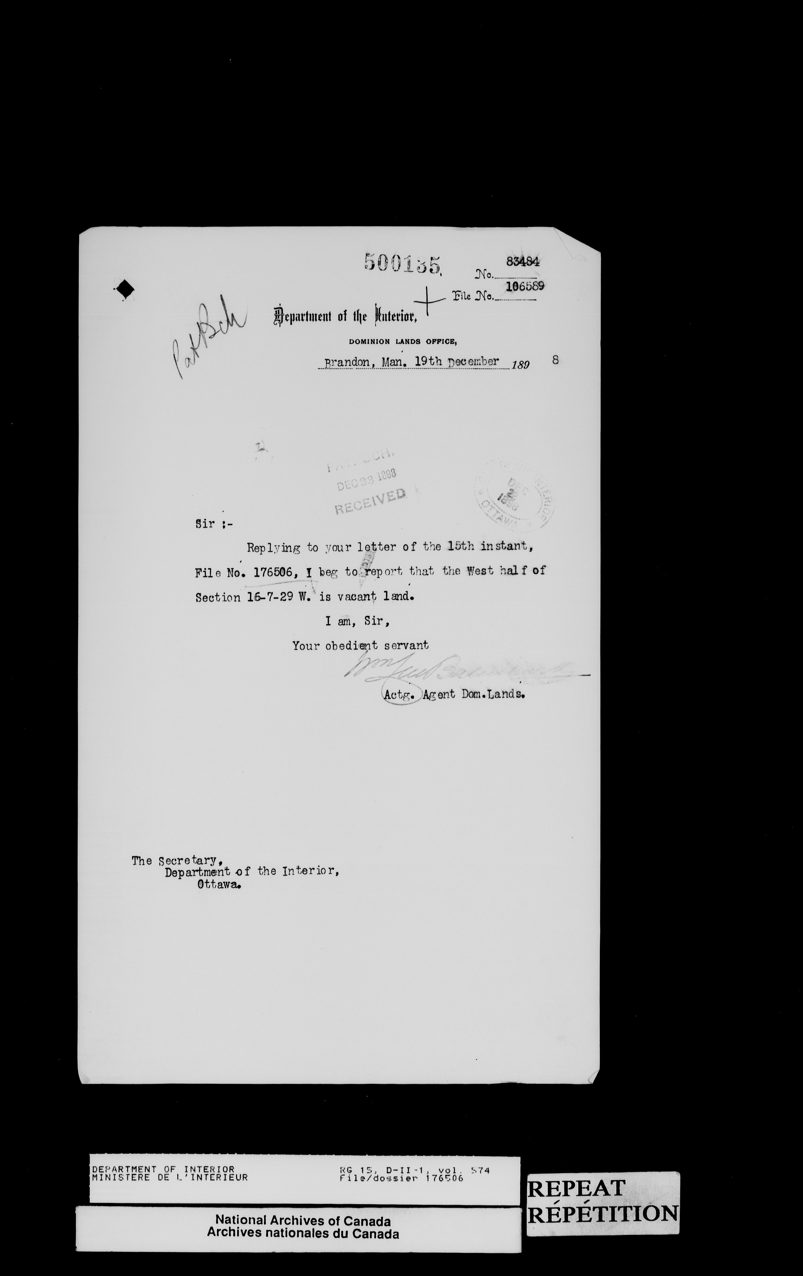Central registry subject files created by the Dominion Lands Branch - 13825