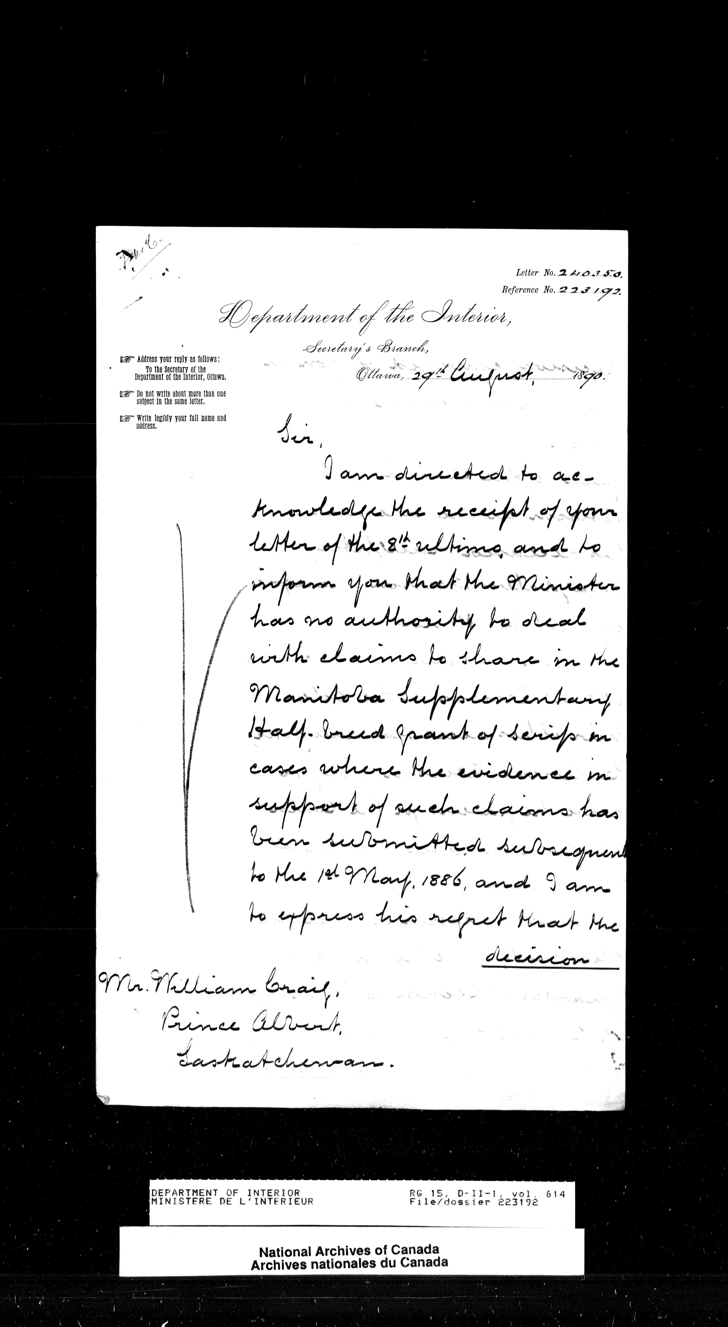 Central registry subject files created by the Dominion Lands Branch - 13862