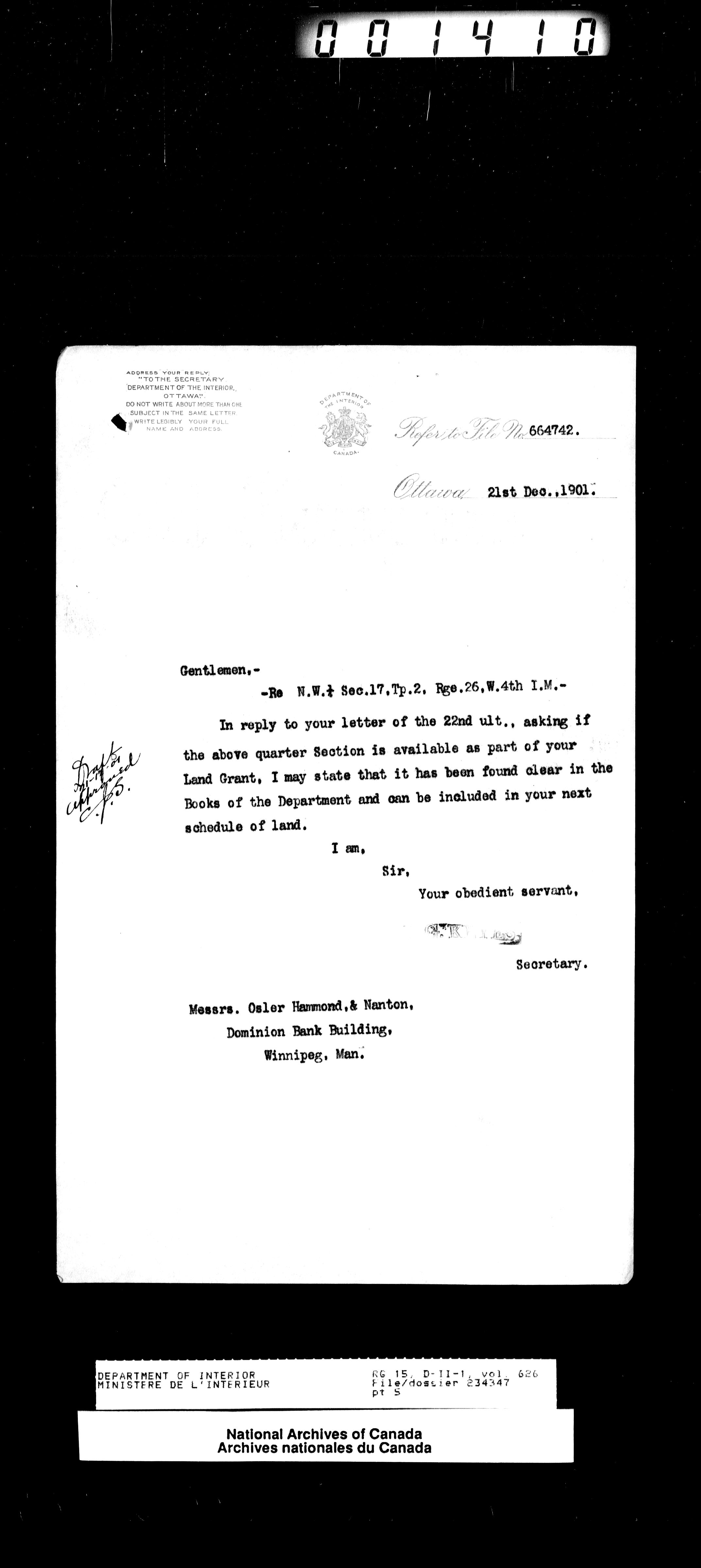 Central registry subject files created by the Dominion Lands Branch - 13873