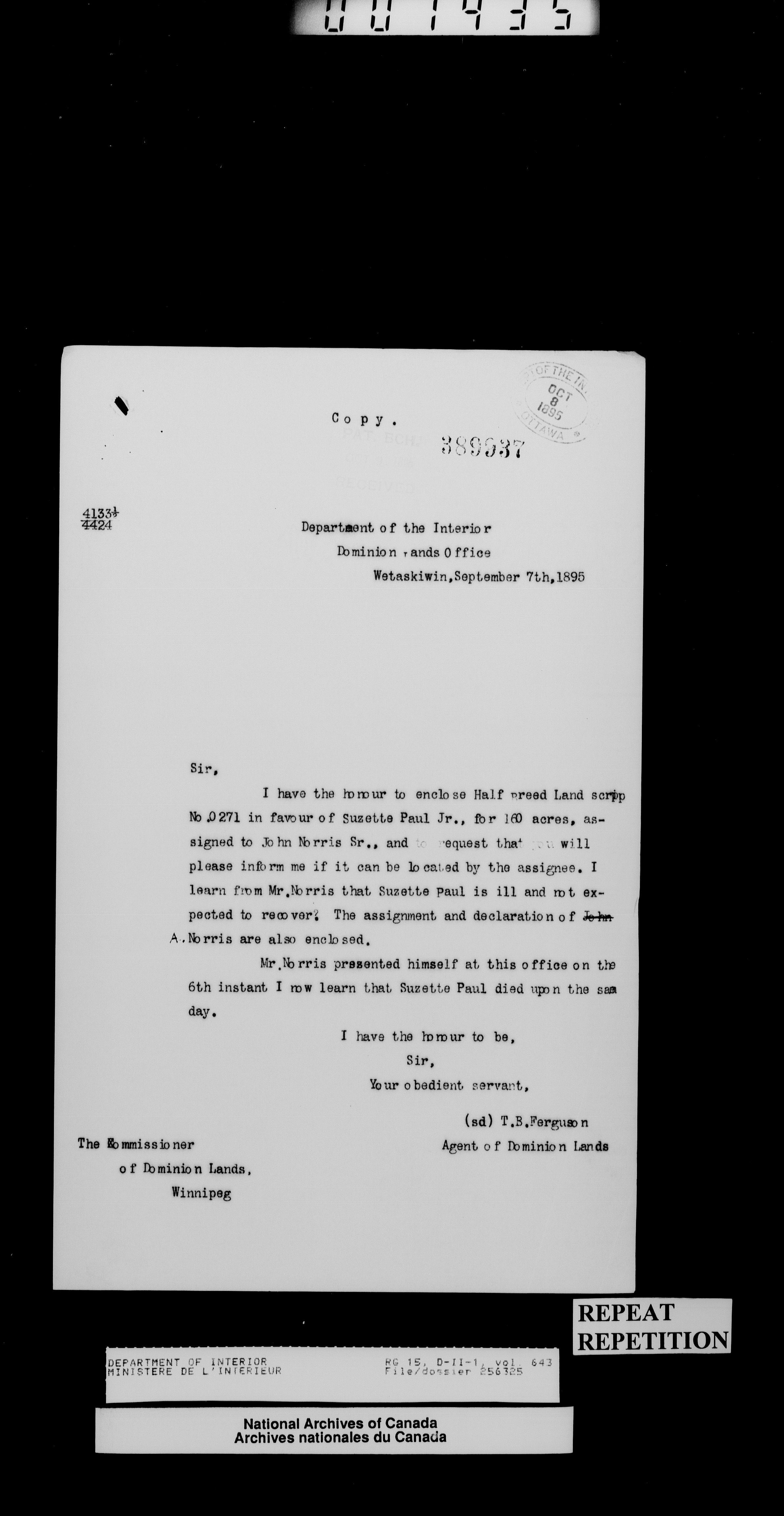 Central registry subject files created by the Dominion Lands Branch - 13890