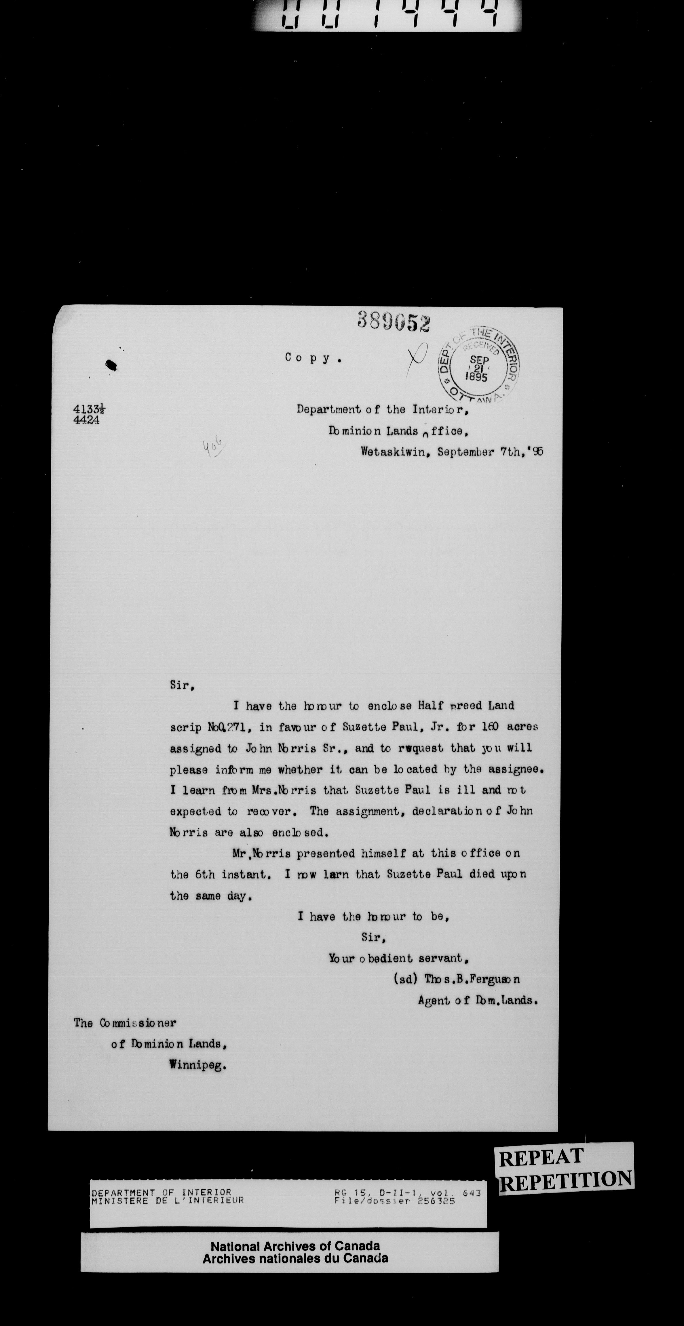 Central registry subject files created by the Dominion Lands Branch - 13890