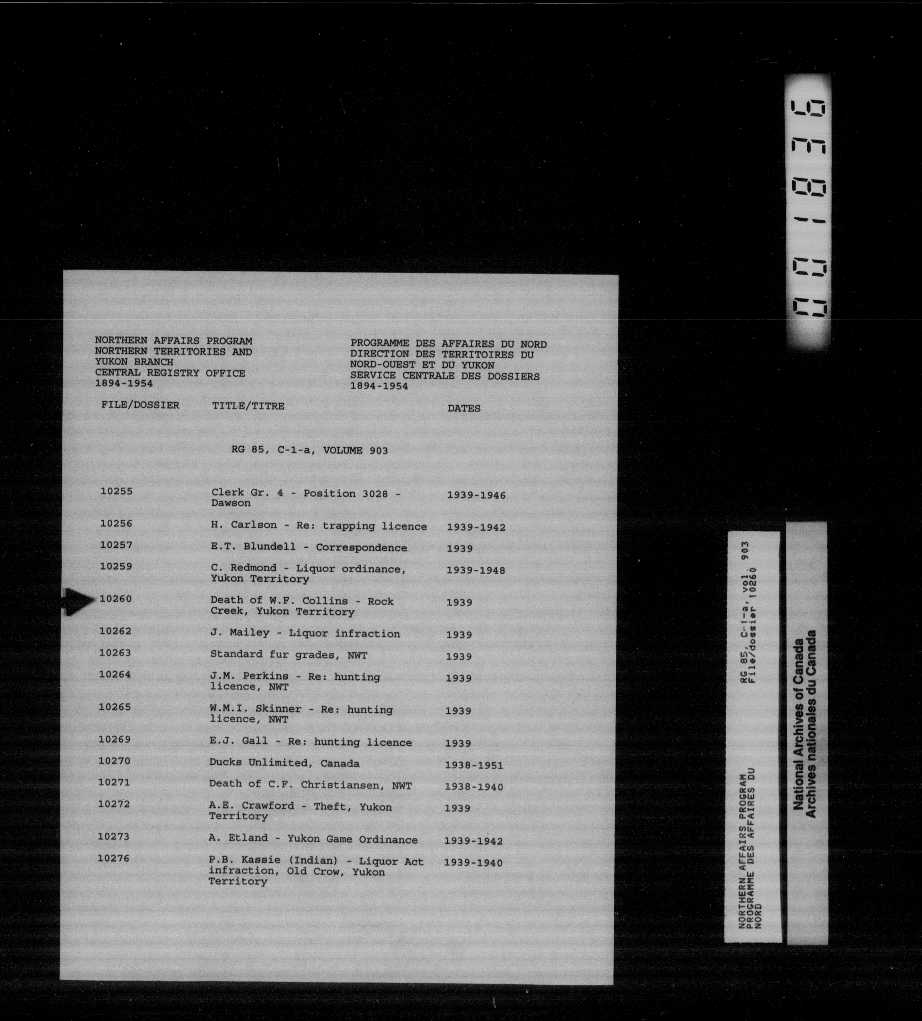 Department of Indian Affairs : Northwest Territories and Yukon Branch, Central Registry files - 13918
