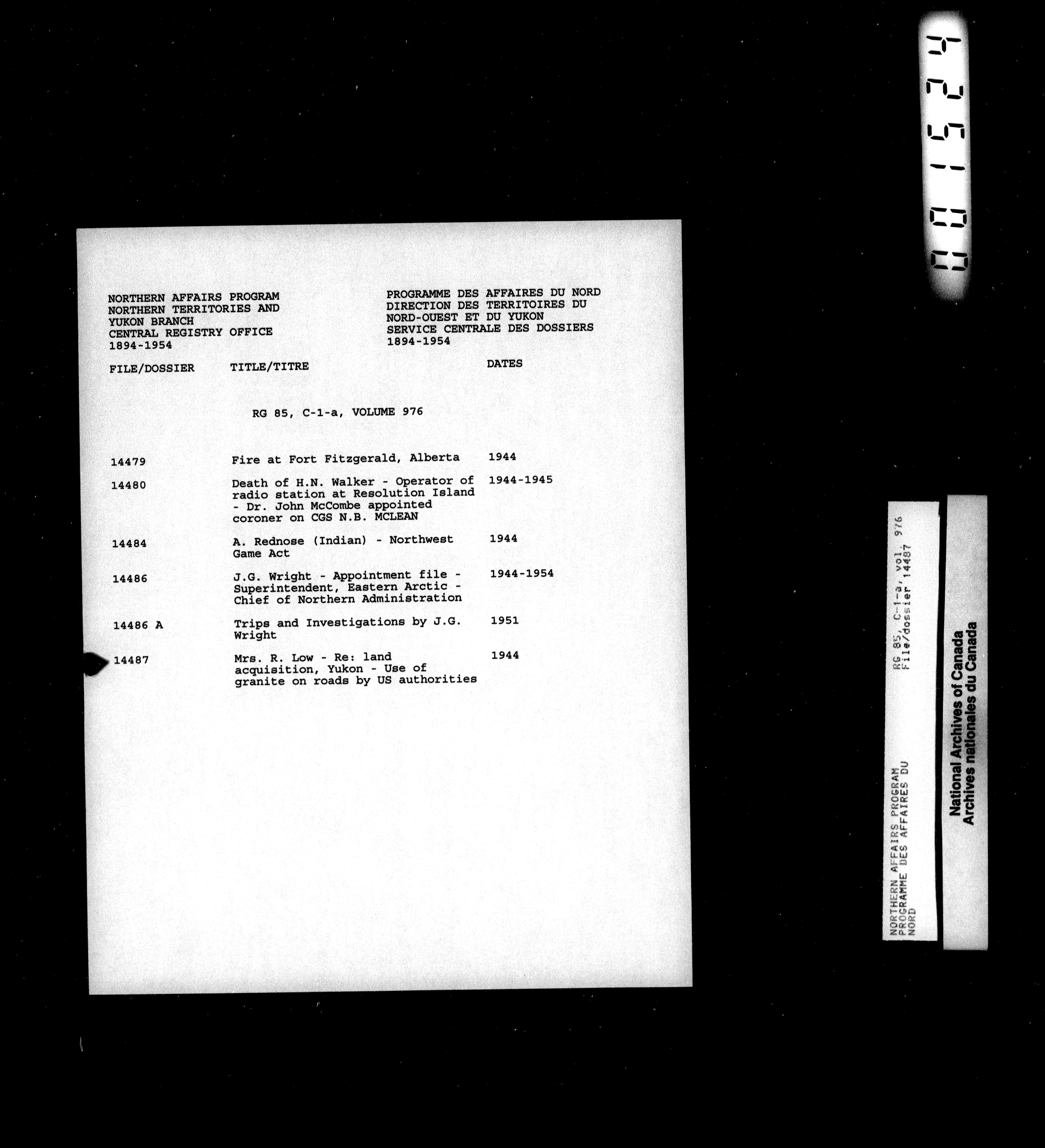 Department of Indian Affairs : Northwest Territories and Yukon Branch, Central Registry files - 13966