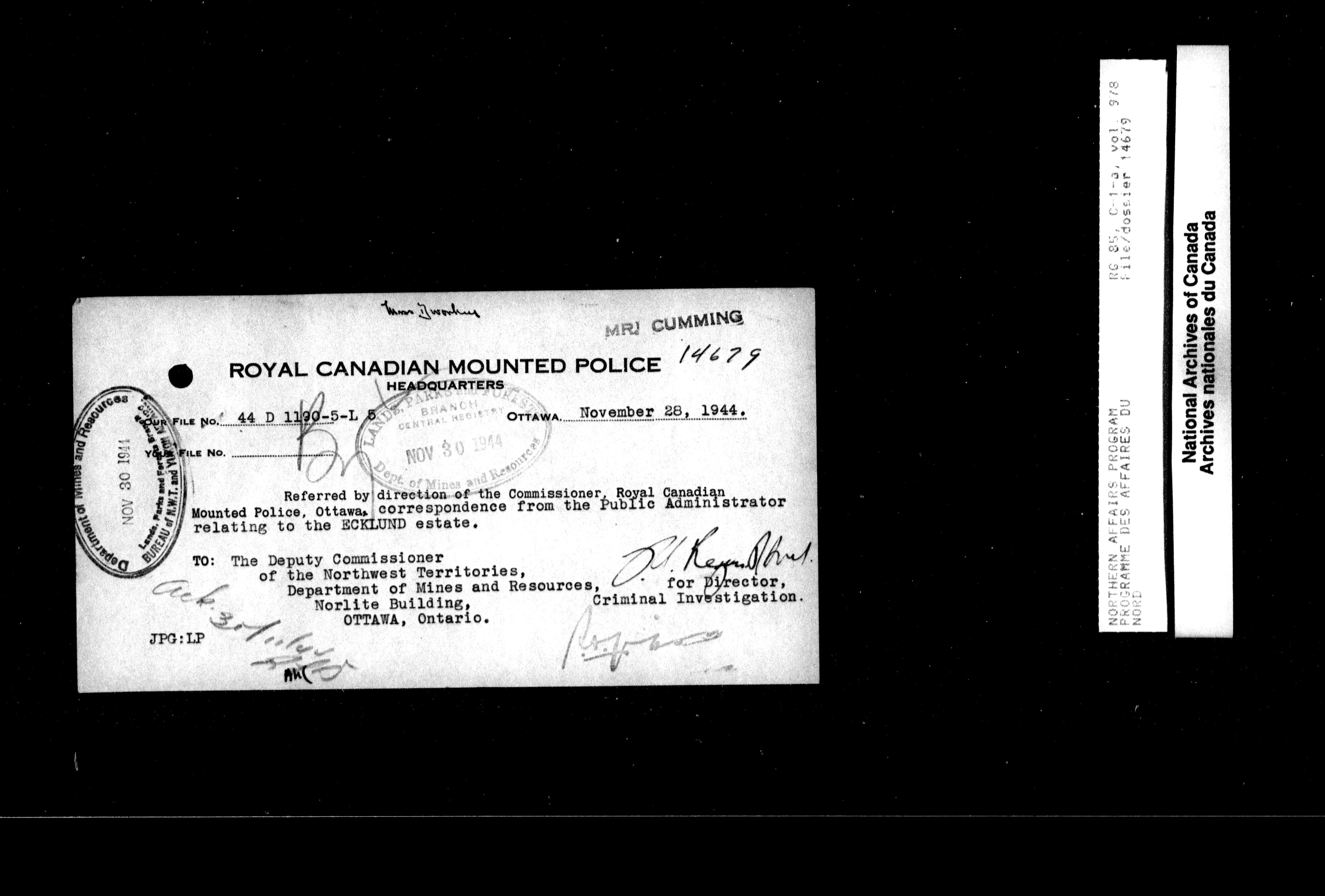 Department of Indian Affairs : Northwest Territories and Yukon Branch, Central Registry files - 13968