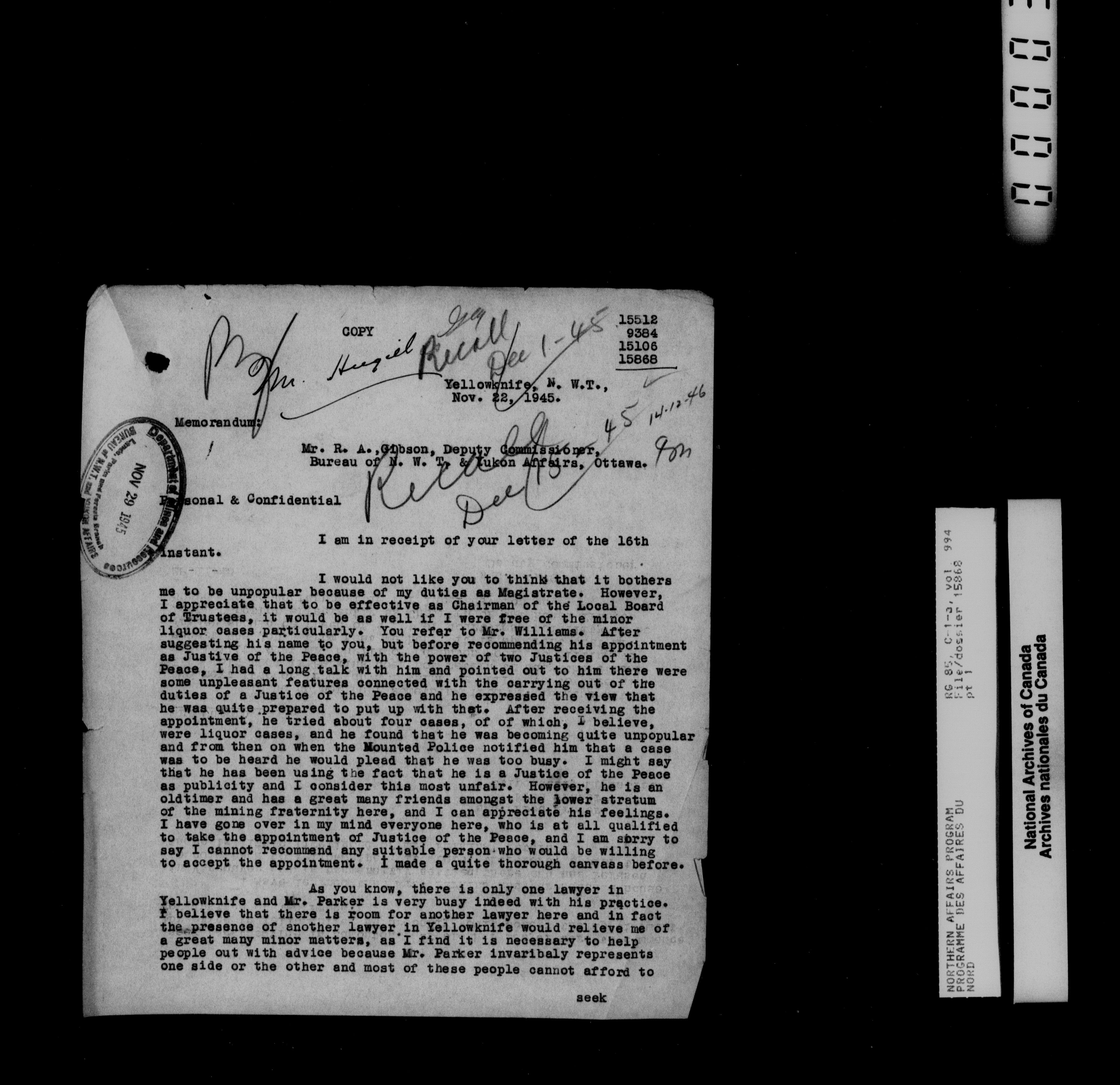 Department of Indian Affairs : Northwest Territories and Yukon Branch, Central Registry files - 13980