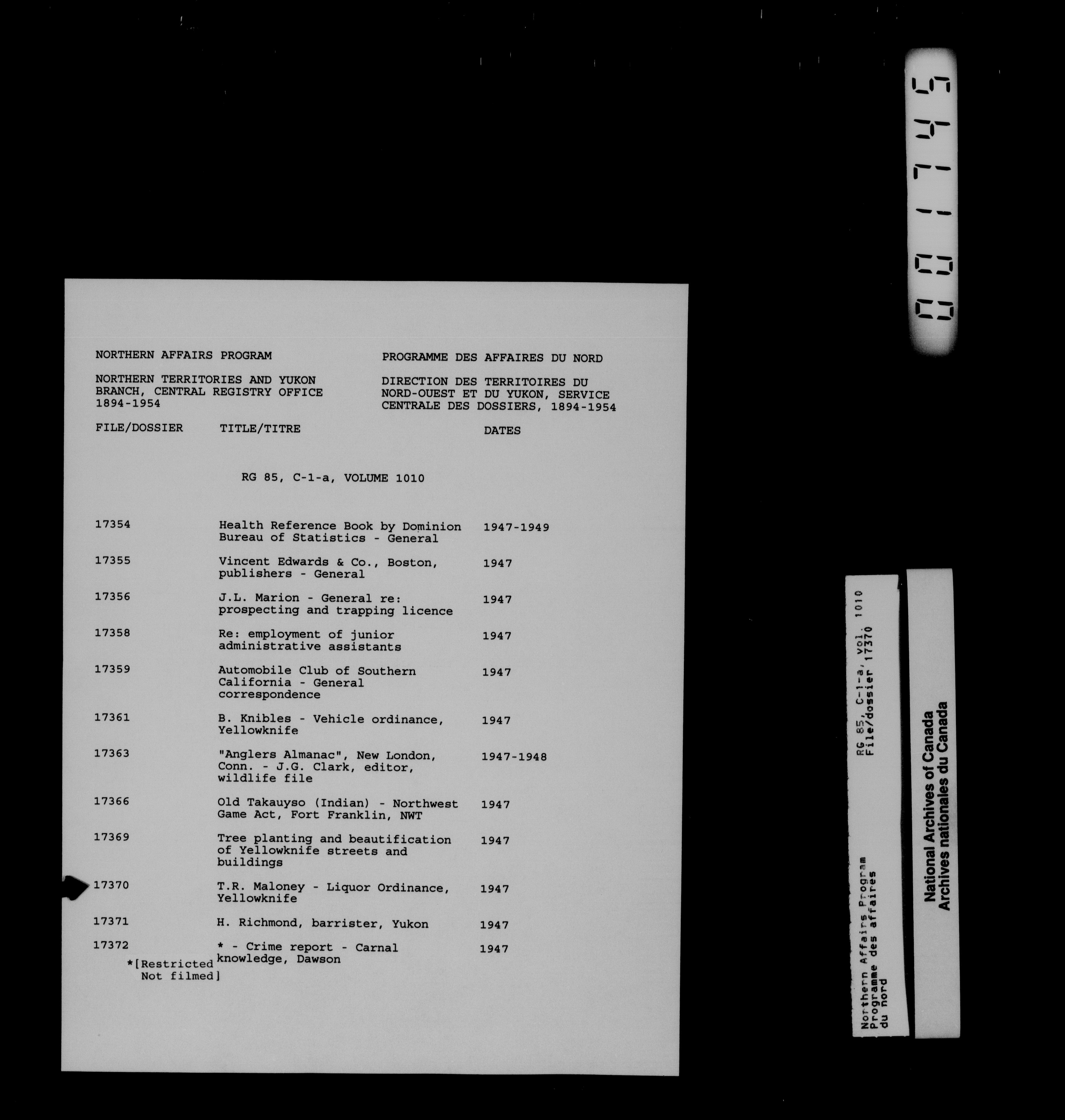 Department of Indian Affairs : Northwest Territories and Yukon Branch, Central Registry files - 13990
