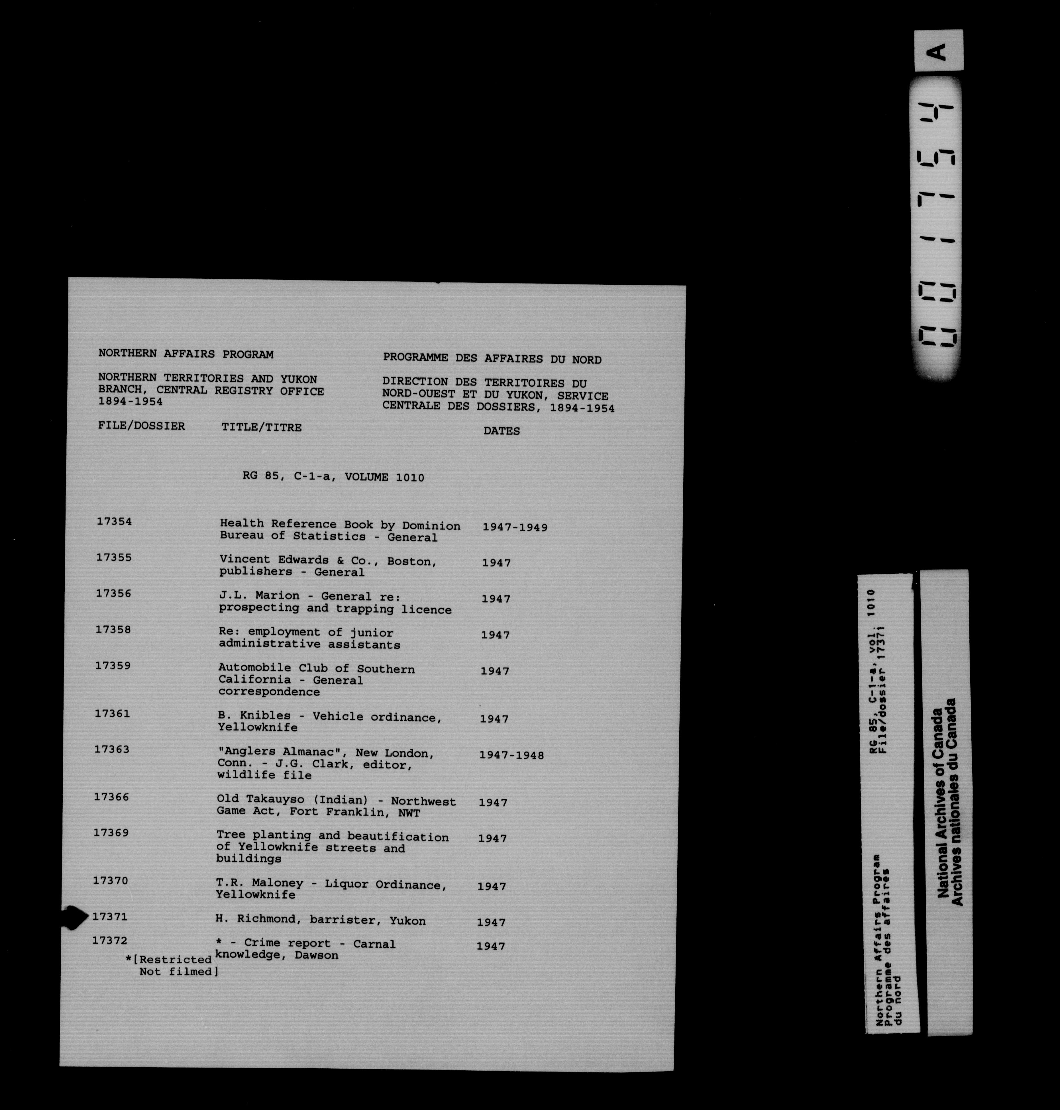 Department of Indian Affairs : Northwest Territories and Yukon Branch, Central Registry files - 13990