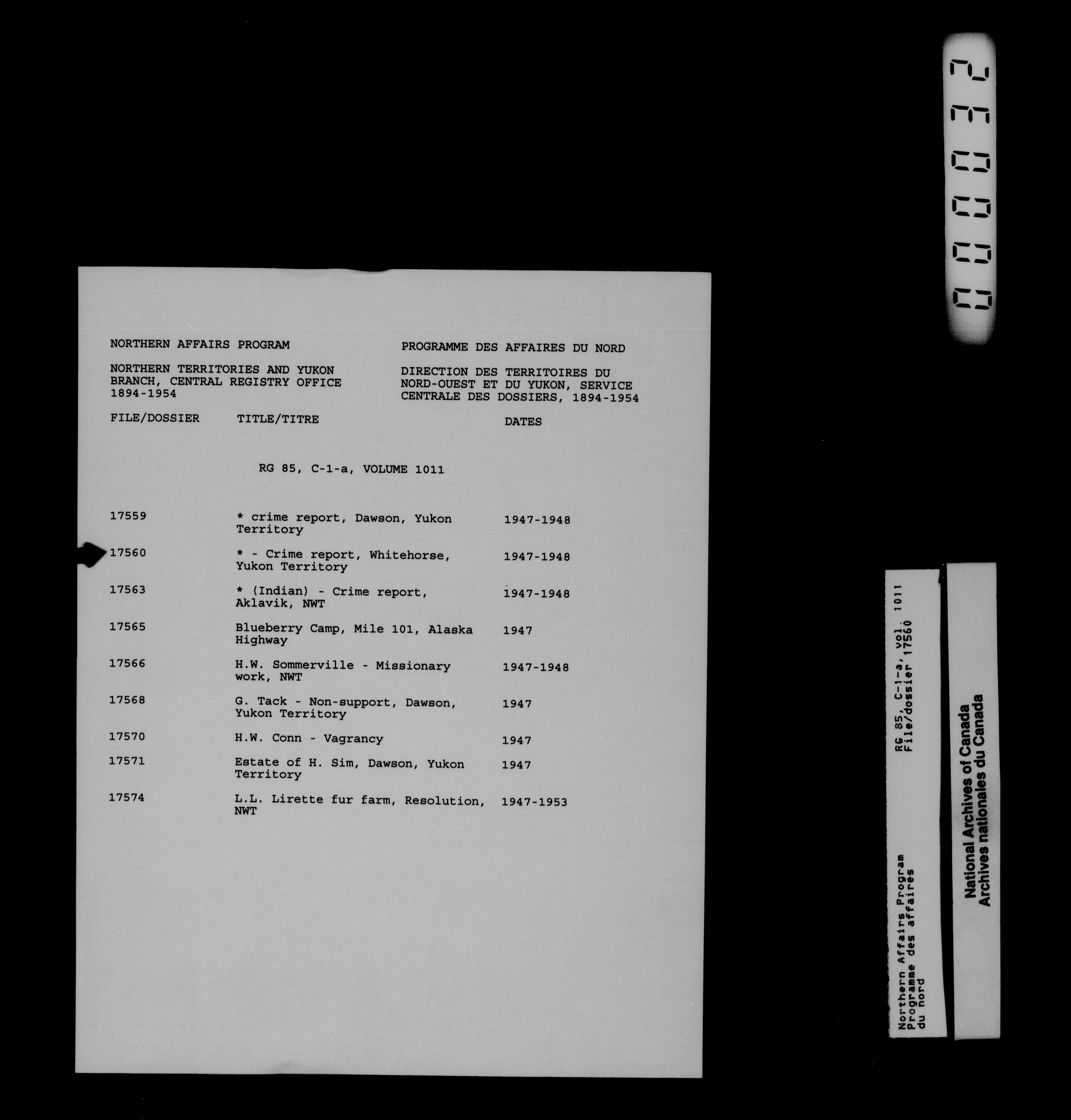 Department of Indian Affairs : Northwest Territories and Yukon Branch, Central Registry files - 13992