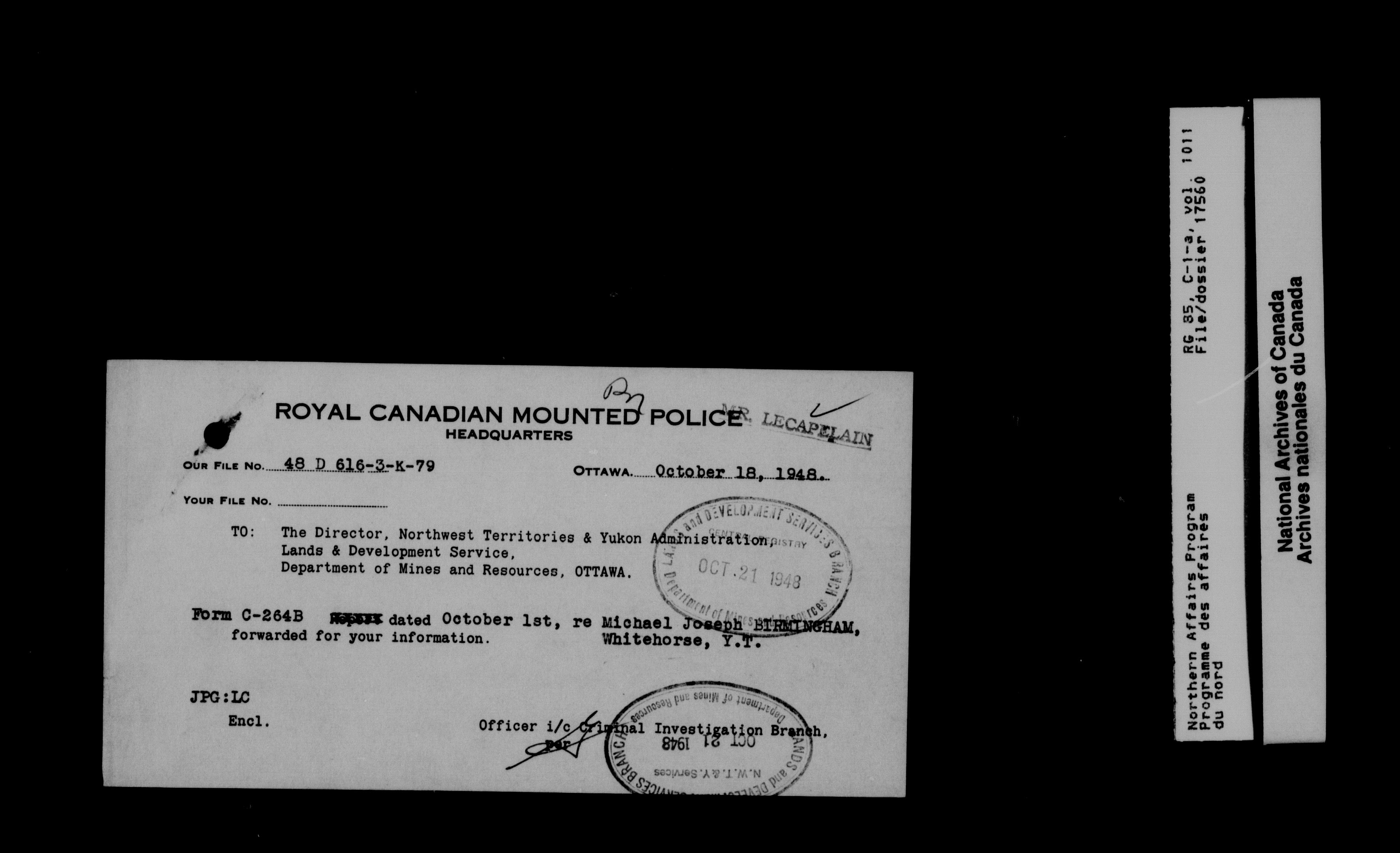 Department of Indian Affairs : Northwest Territories and Yukon Branch, Central Registry files - 13992