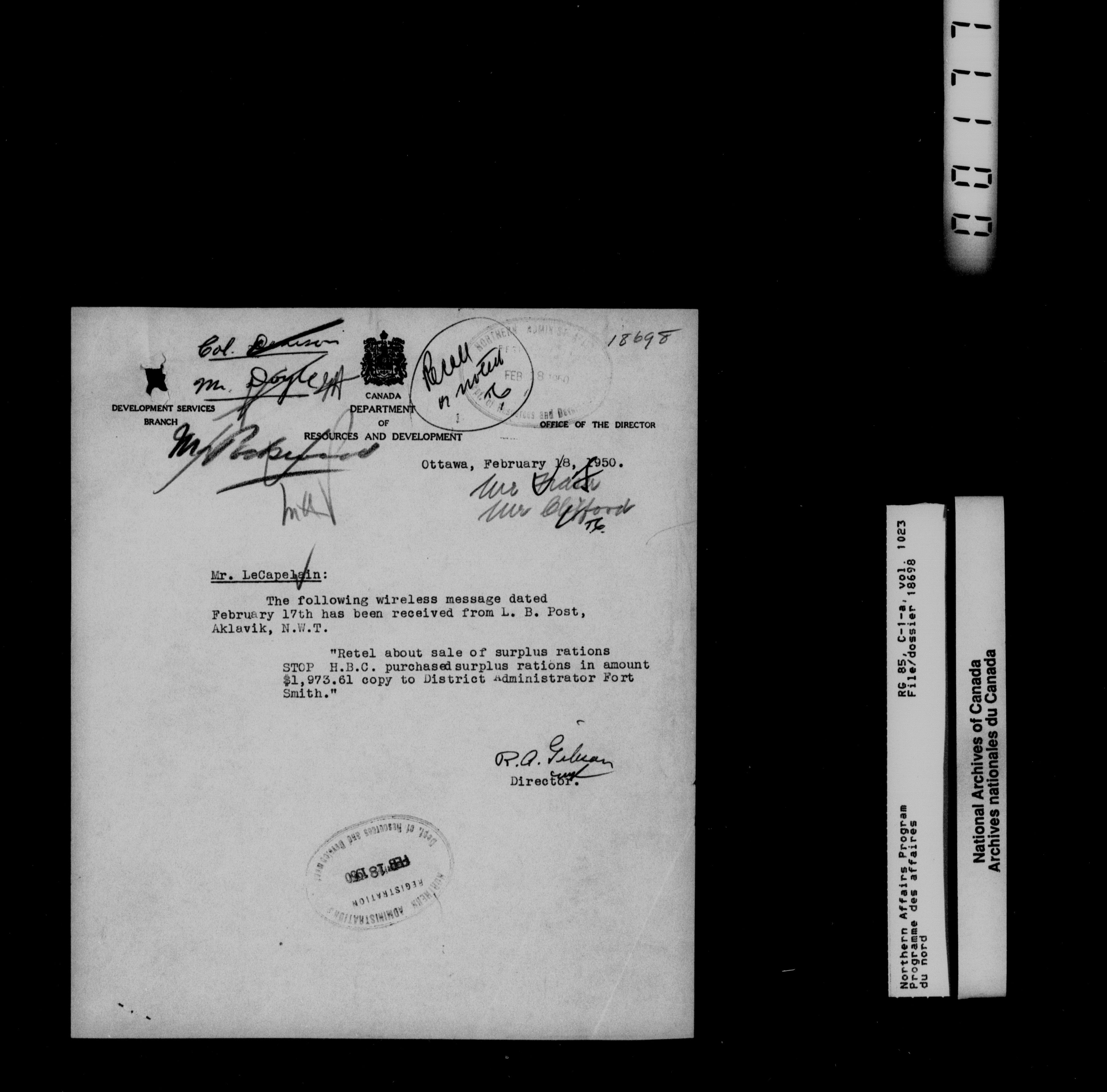 Department of Indian Affairs : Northwest Territories and Yukon Branch, Central Registry files - 13998