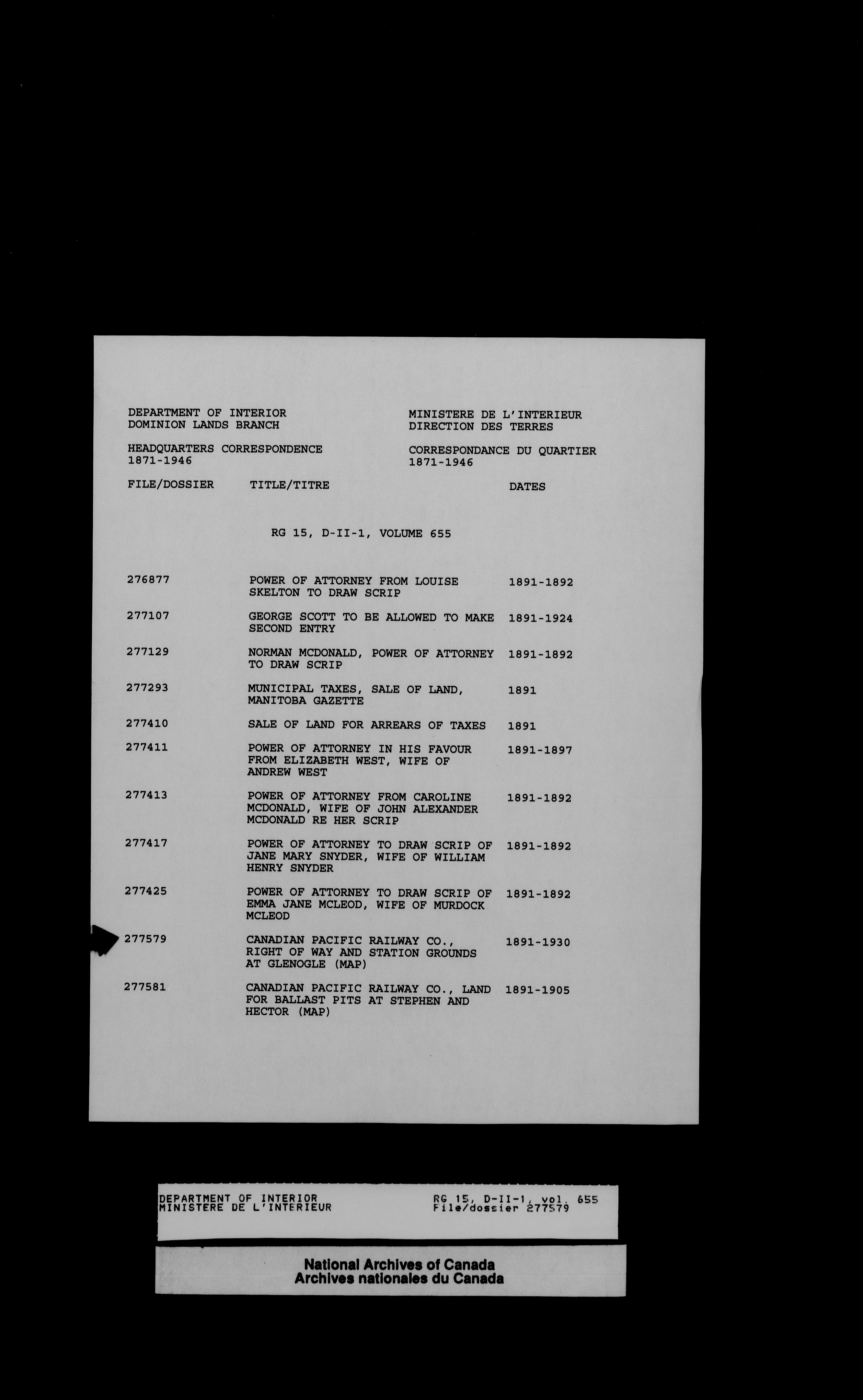 Central registry subject files created by the Dominion Lands Branch - 14404