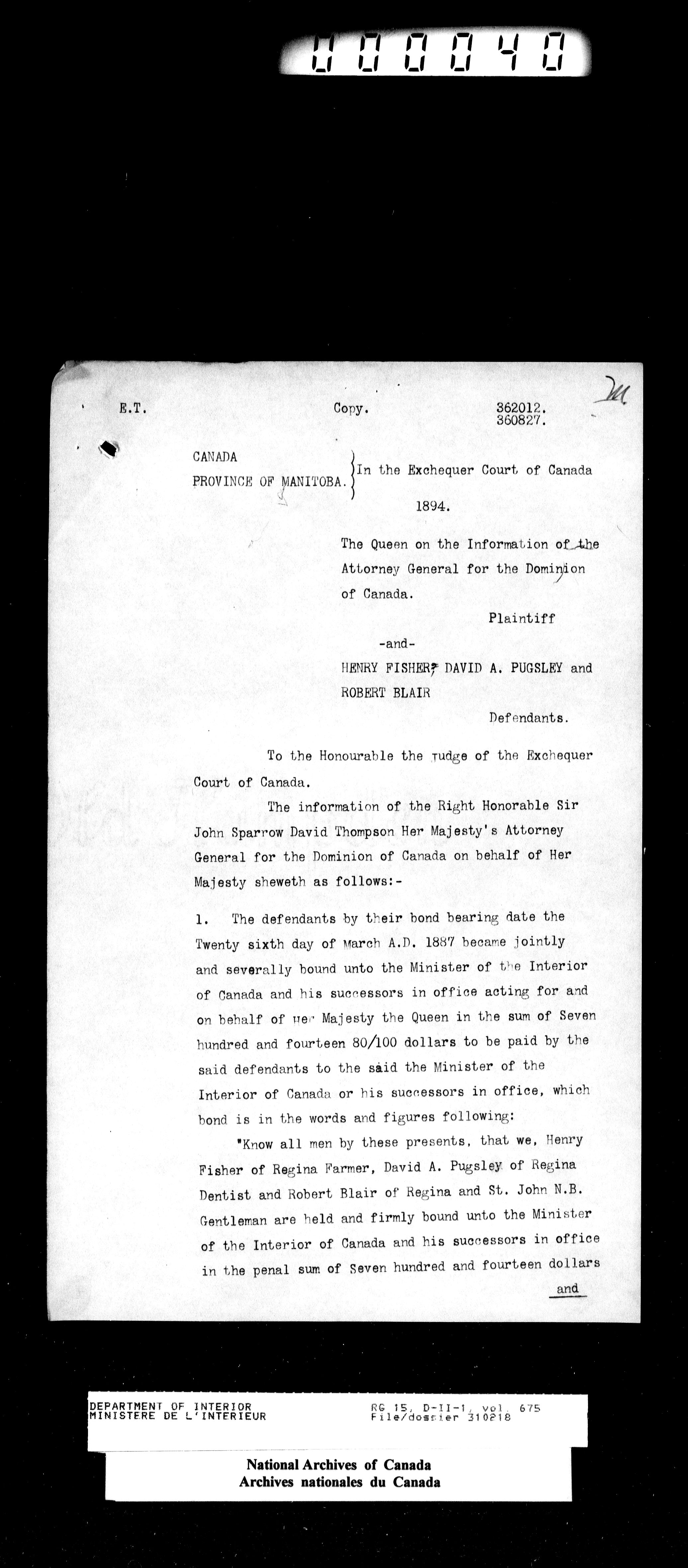 Central registry subject files created by the Dominion Lands Branch - 14423