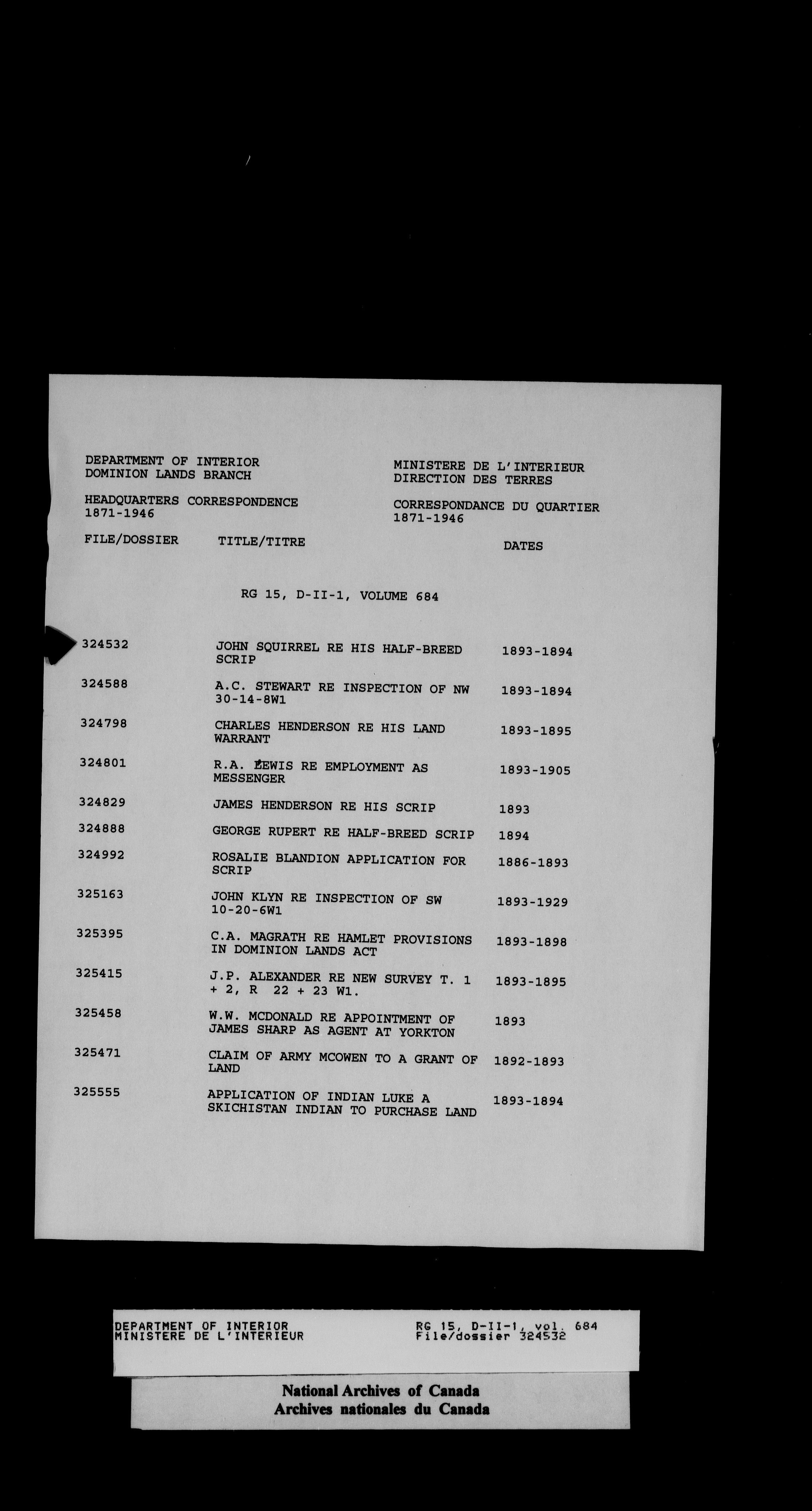 Central registry subject files created by the Dominion Lands Branch - 14430